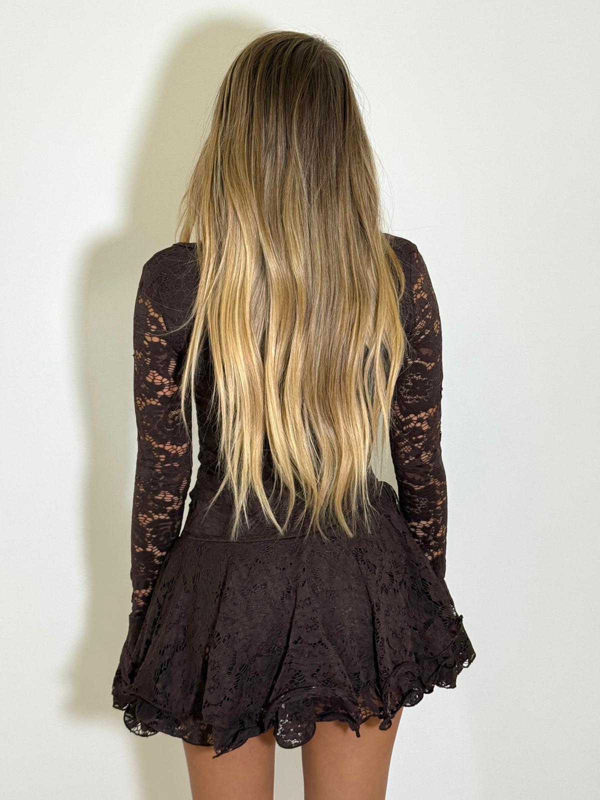 abito in pizzo con bottoni frontali e scollo a cuore .