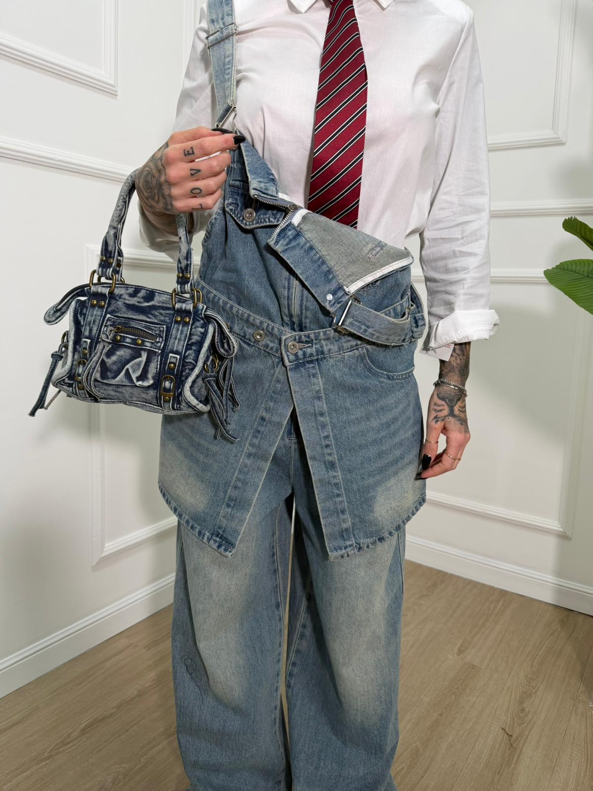 Salopette in tessuto denim , lavaggio medio , dettaglio effetto gonna , cerniera e spalline regolabili , tela fissa , modello ampio, top quality