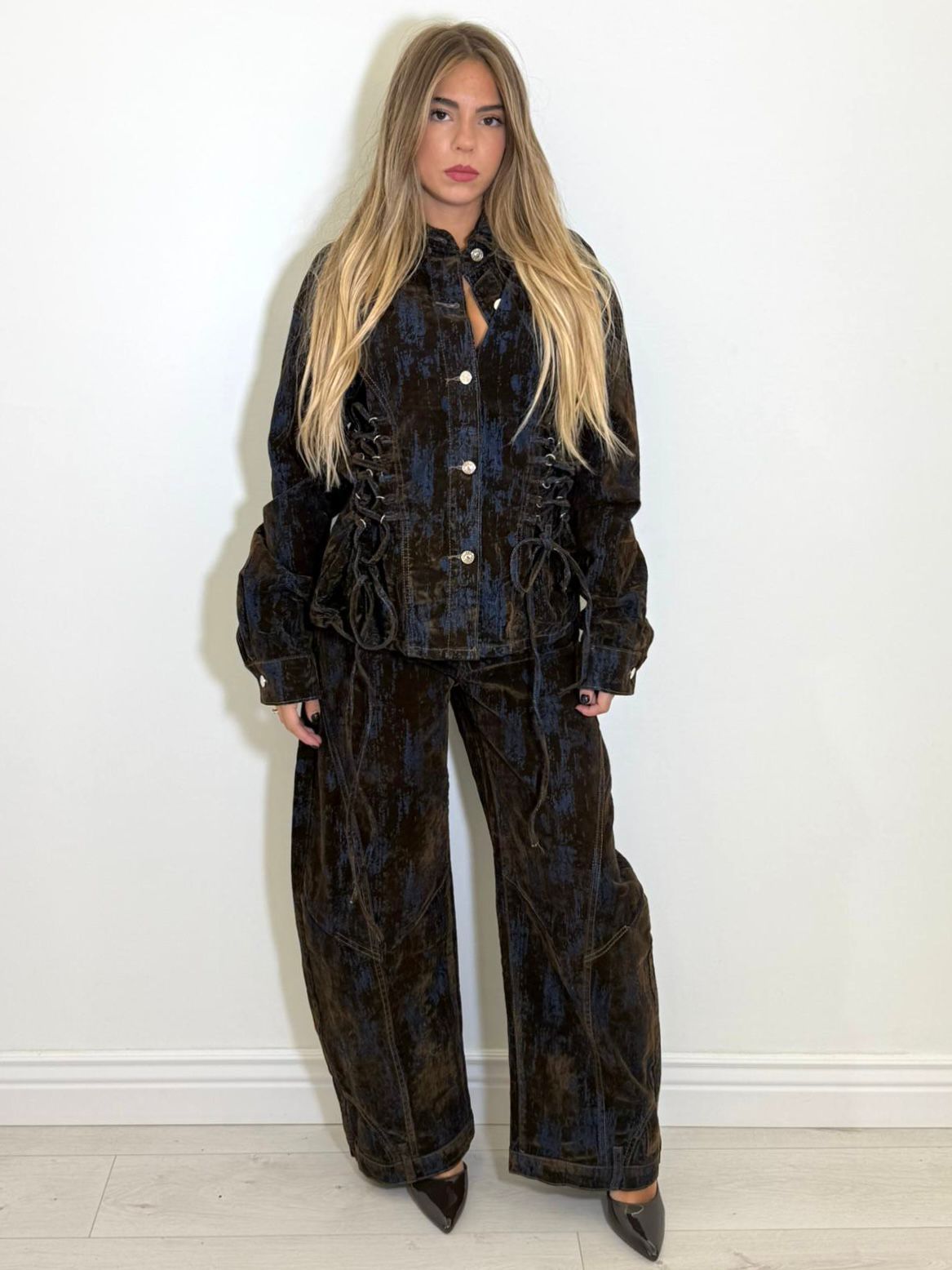 Giacca in camoscio vellutato, laccetti regolabili sui fianchi e bottoncini.