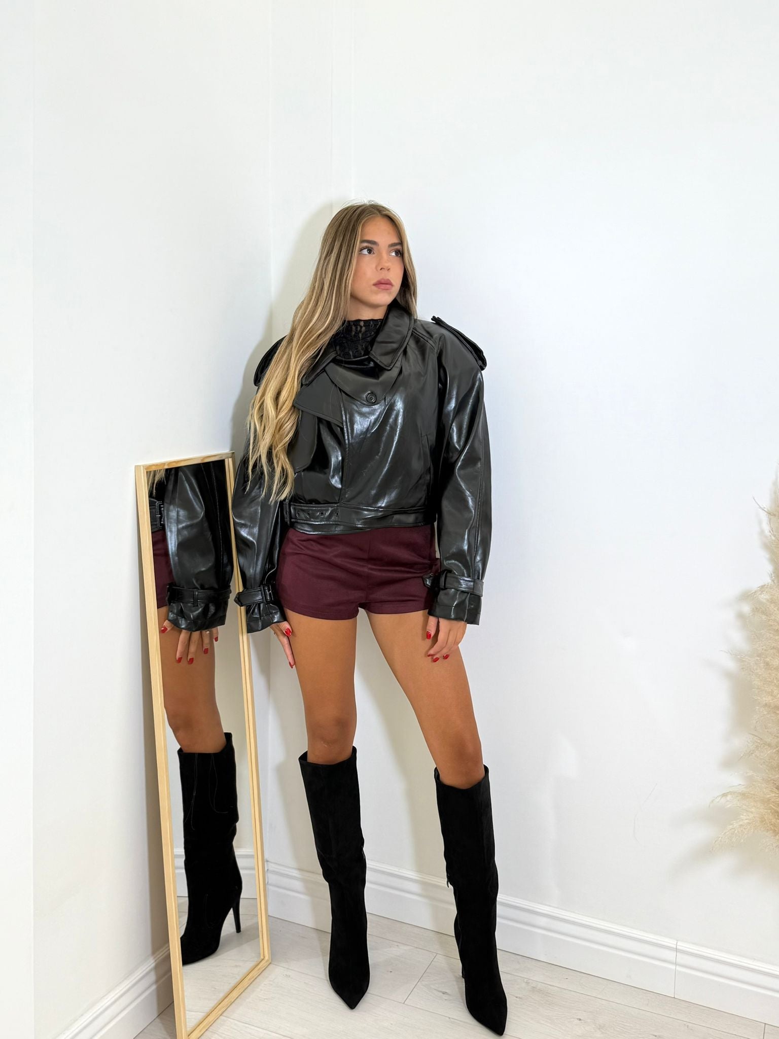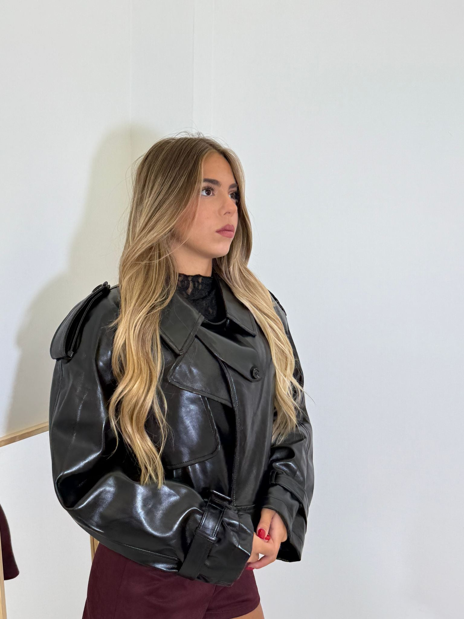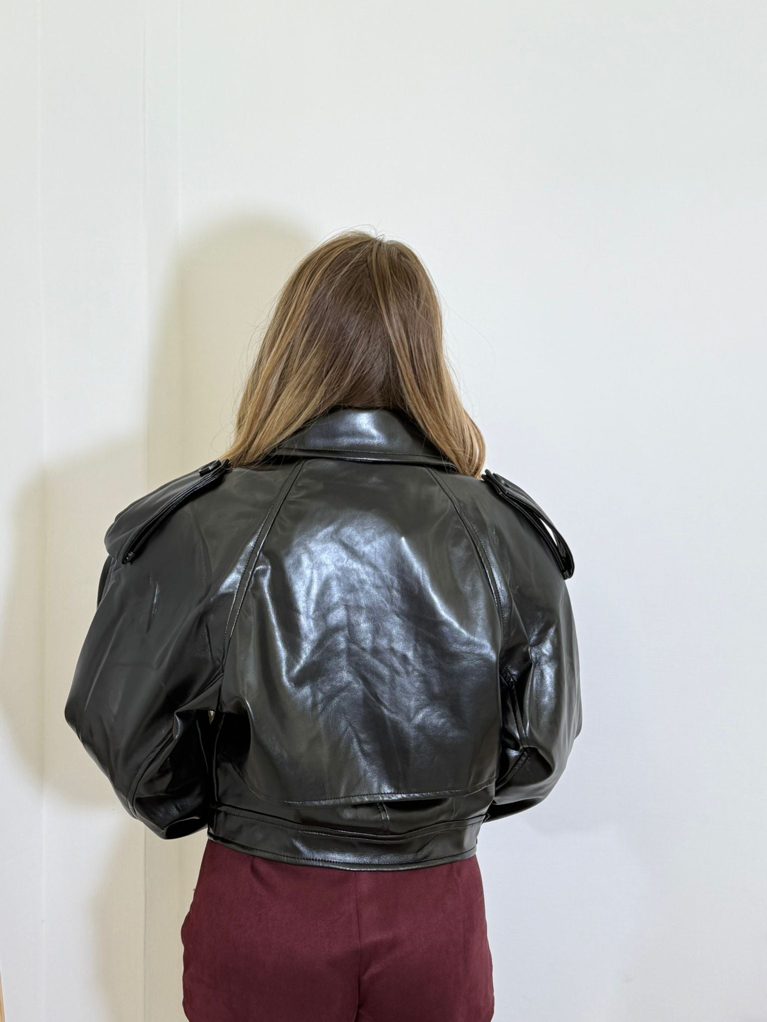 giubbino in ecopelle crop con cerniera sul d'avanti e cintura in vita.