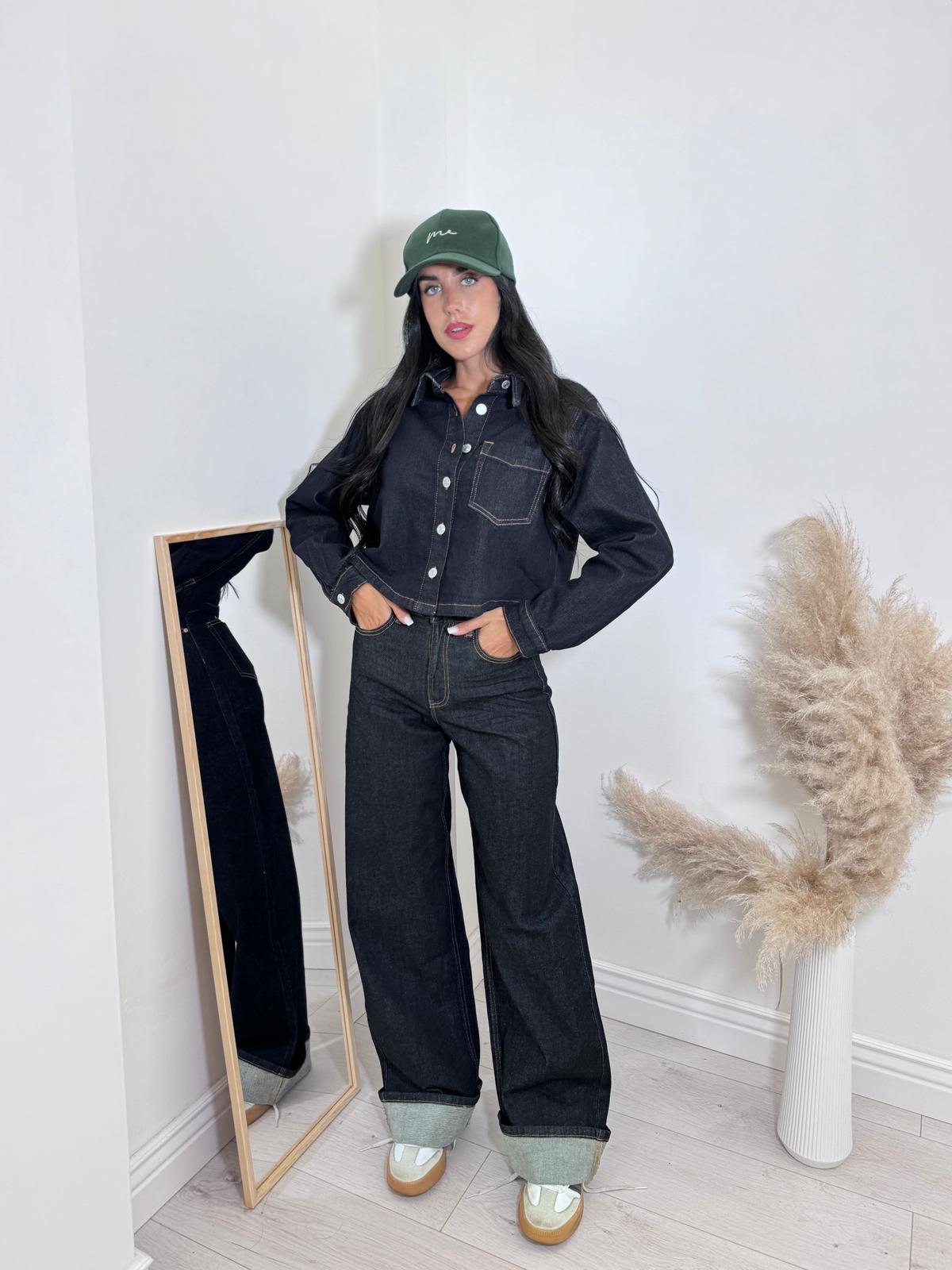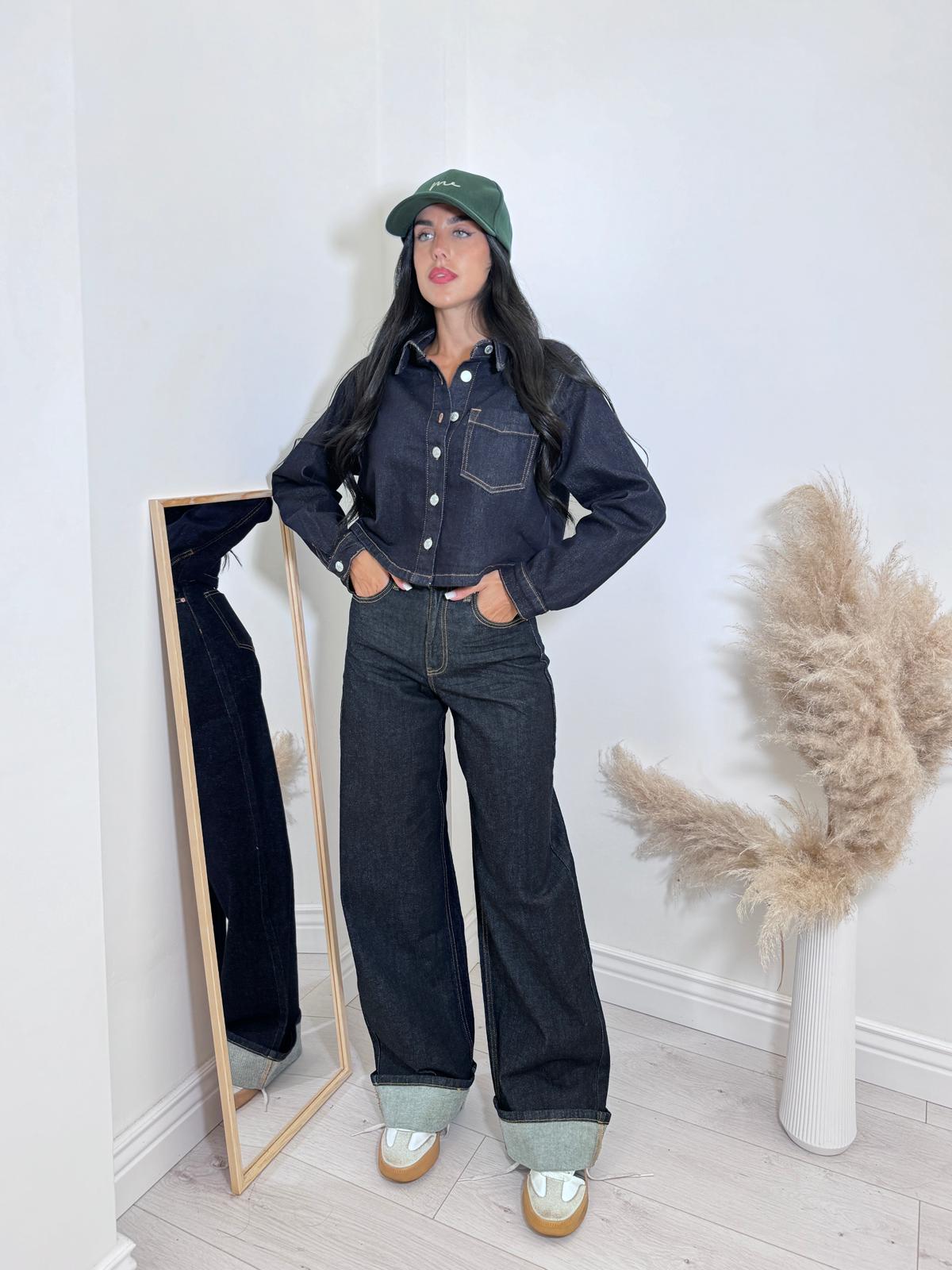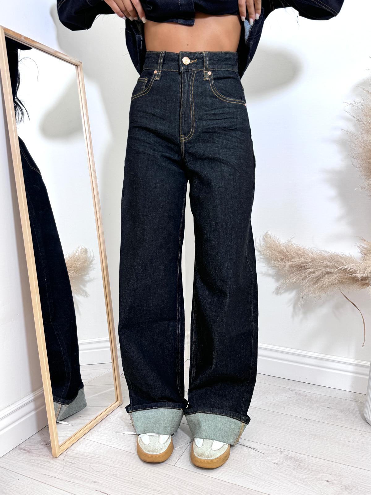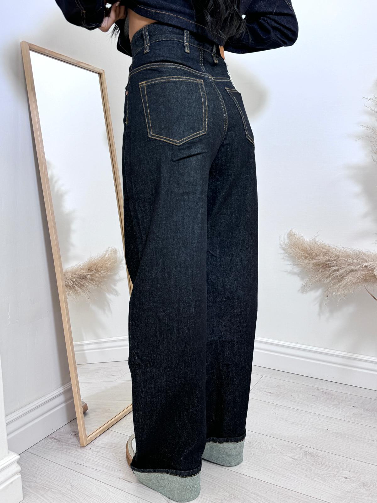 Jeans in tela fissa, modello palazzo, chiusura con bottone.