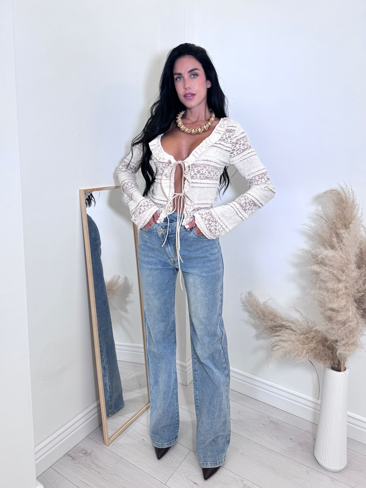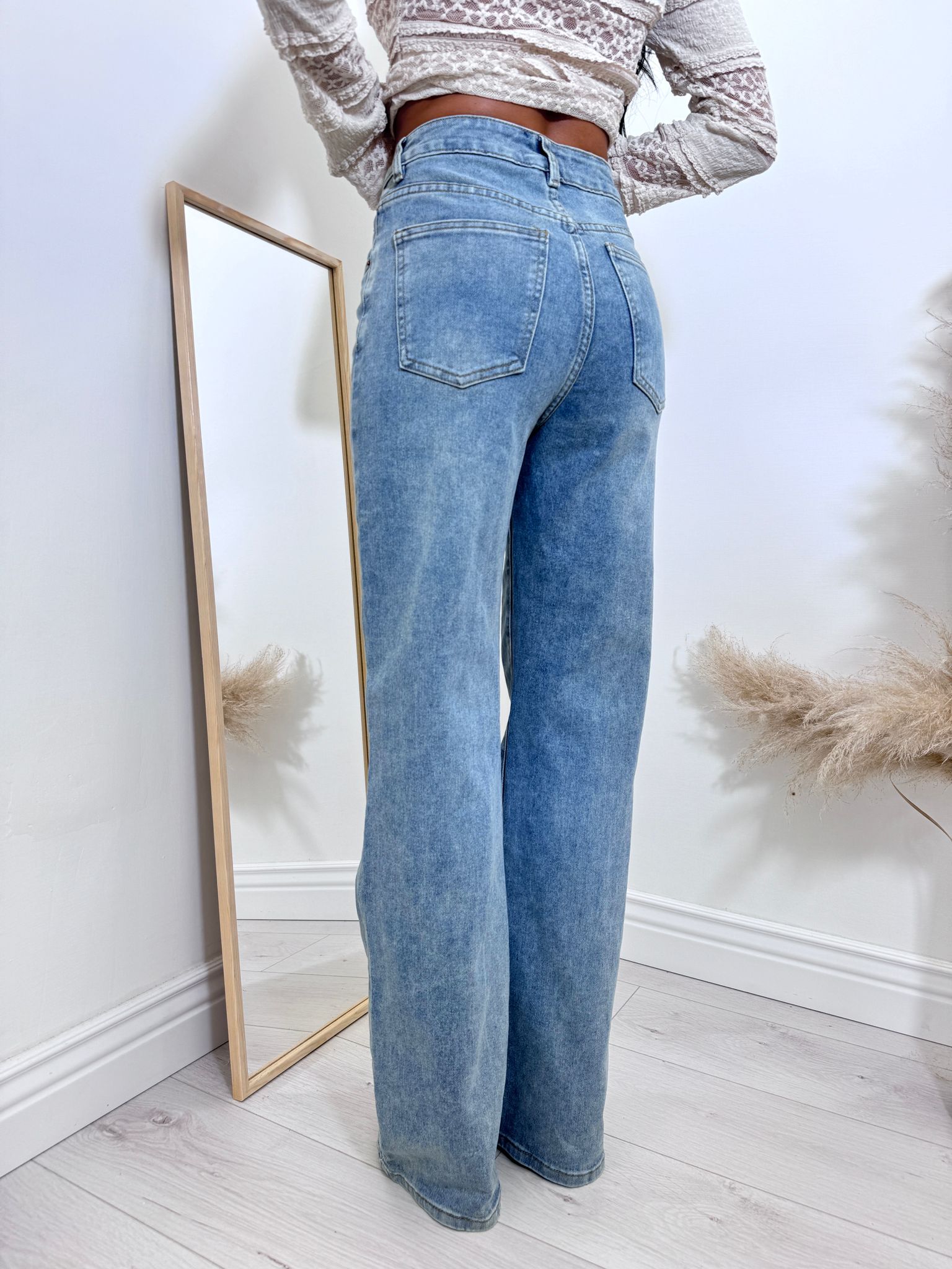 Jeans in tela elastica, modello a gamba dritta con chiusura asimmetrica.