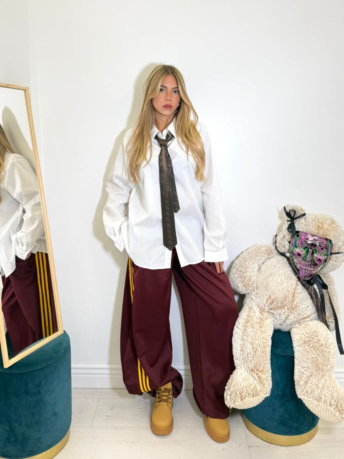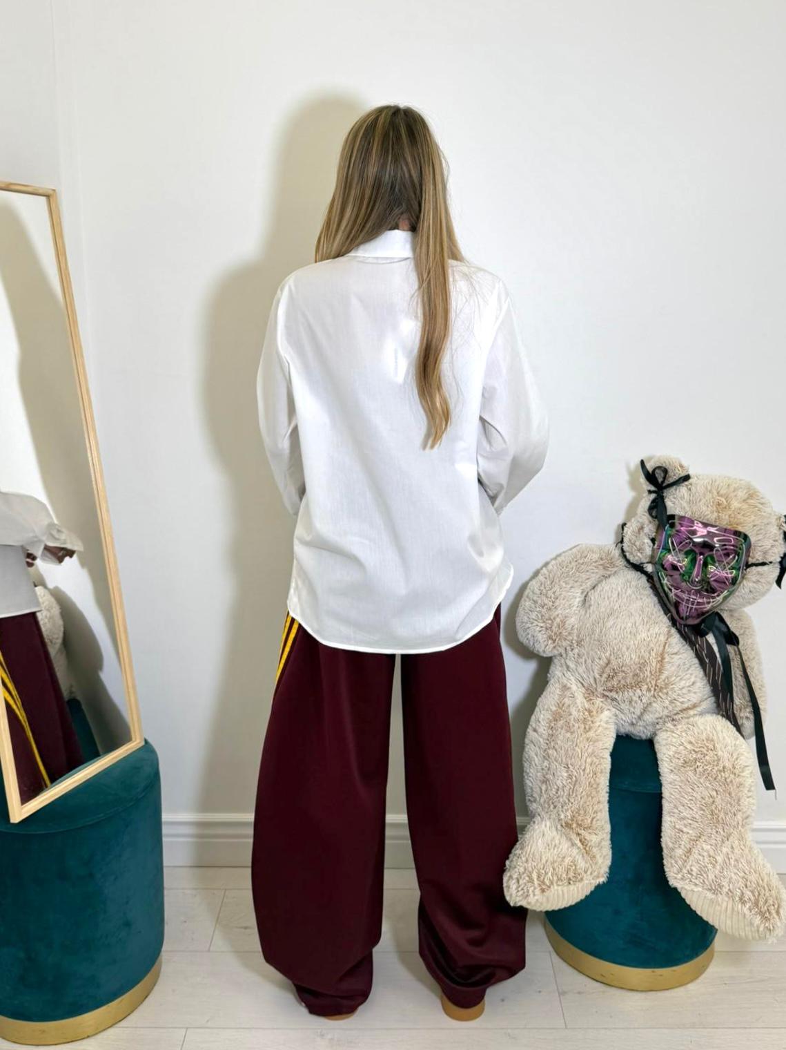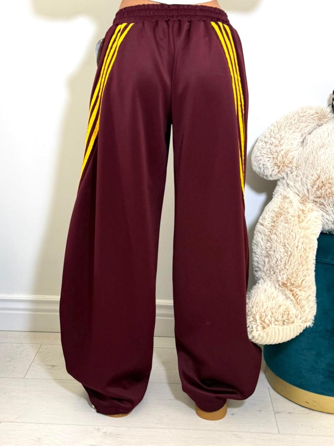 Pantalone in simil cotone, modello balloon con strisce gialli laterali.