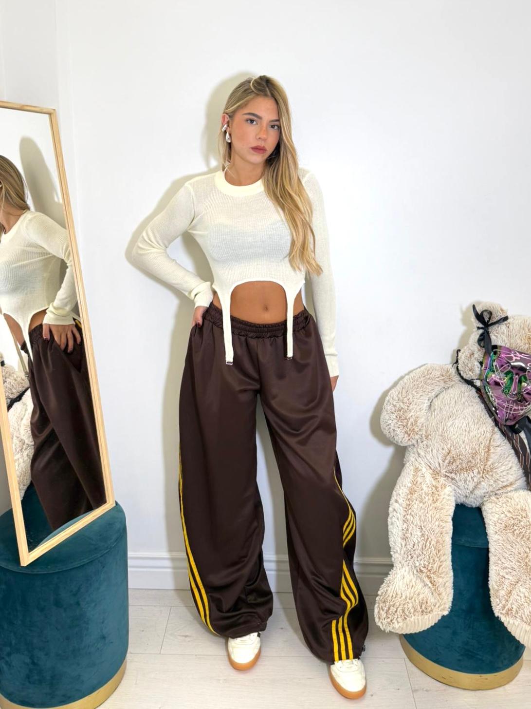Pantalone in simil cotone, modello balloon con strisce gialli laterali.