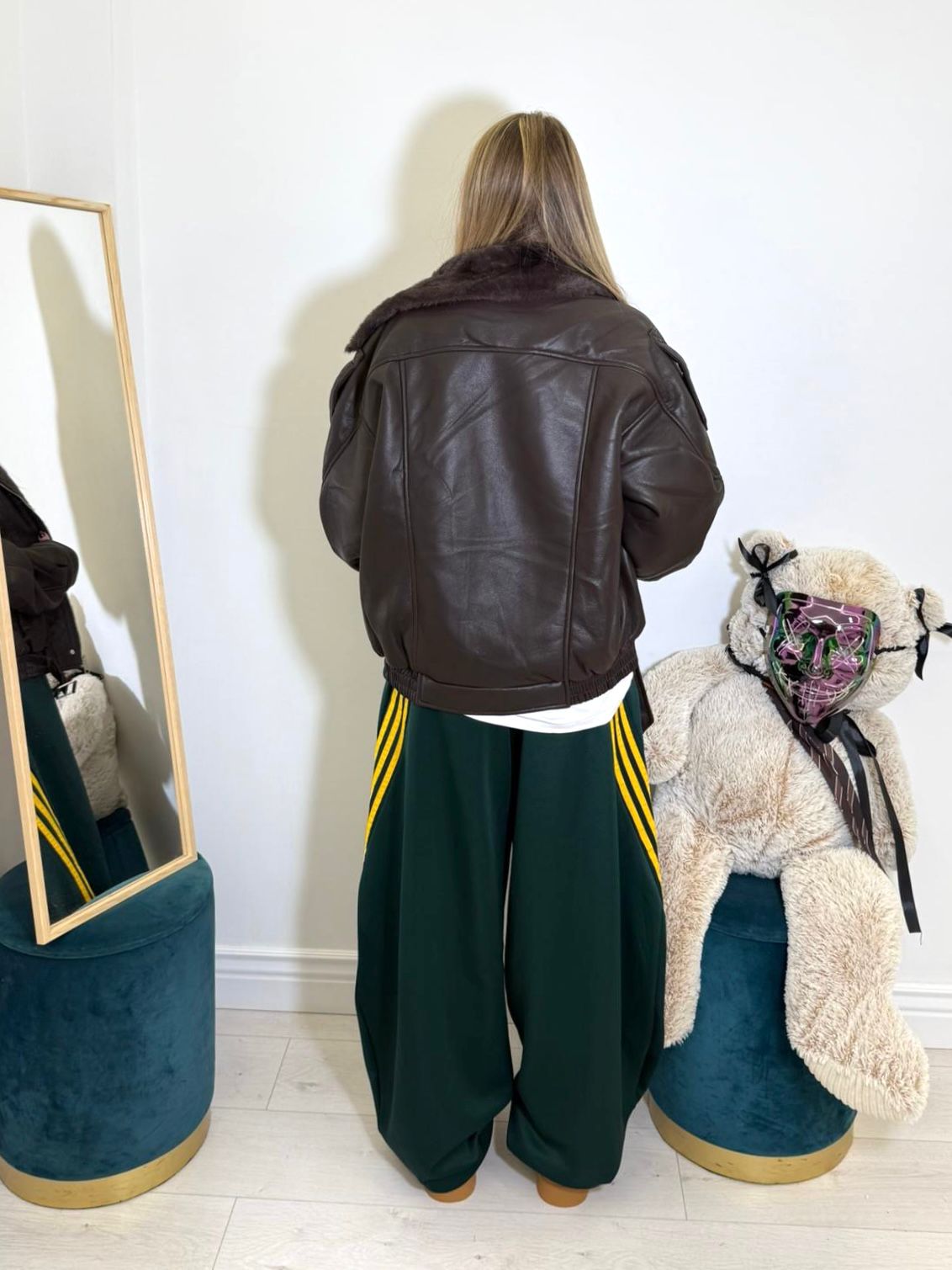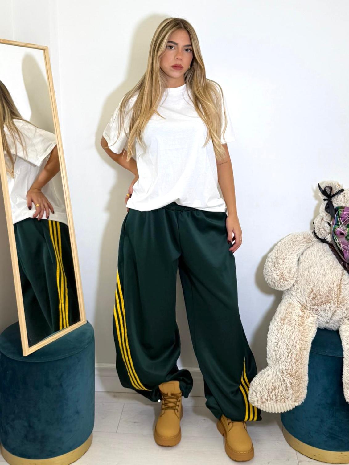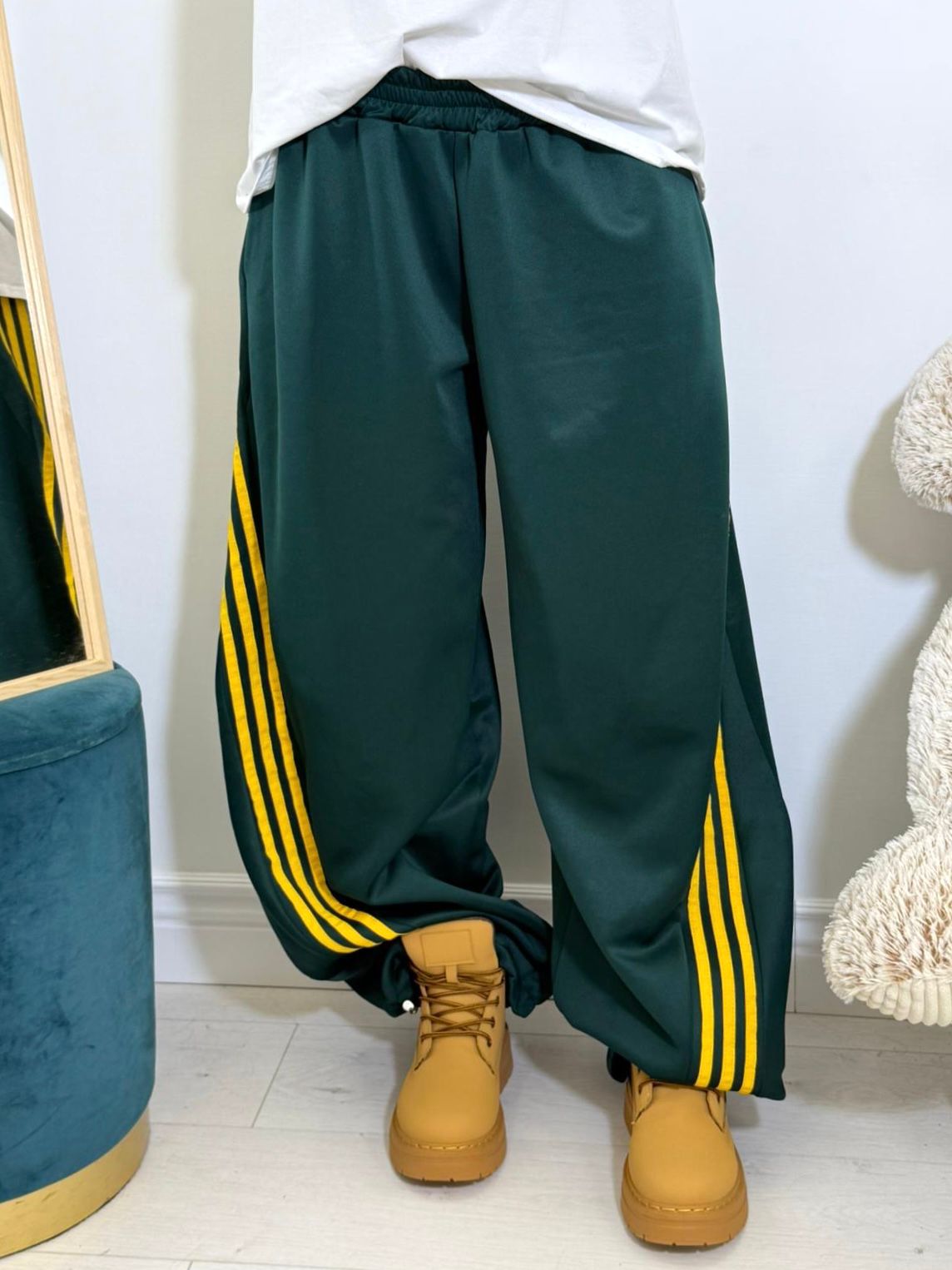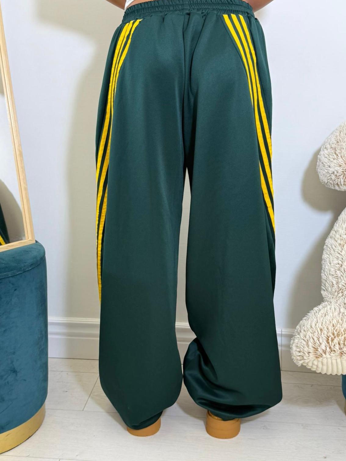 Pantalone in simil cotone, modello balloon con strisce gialli laterali.