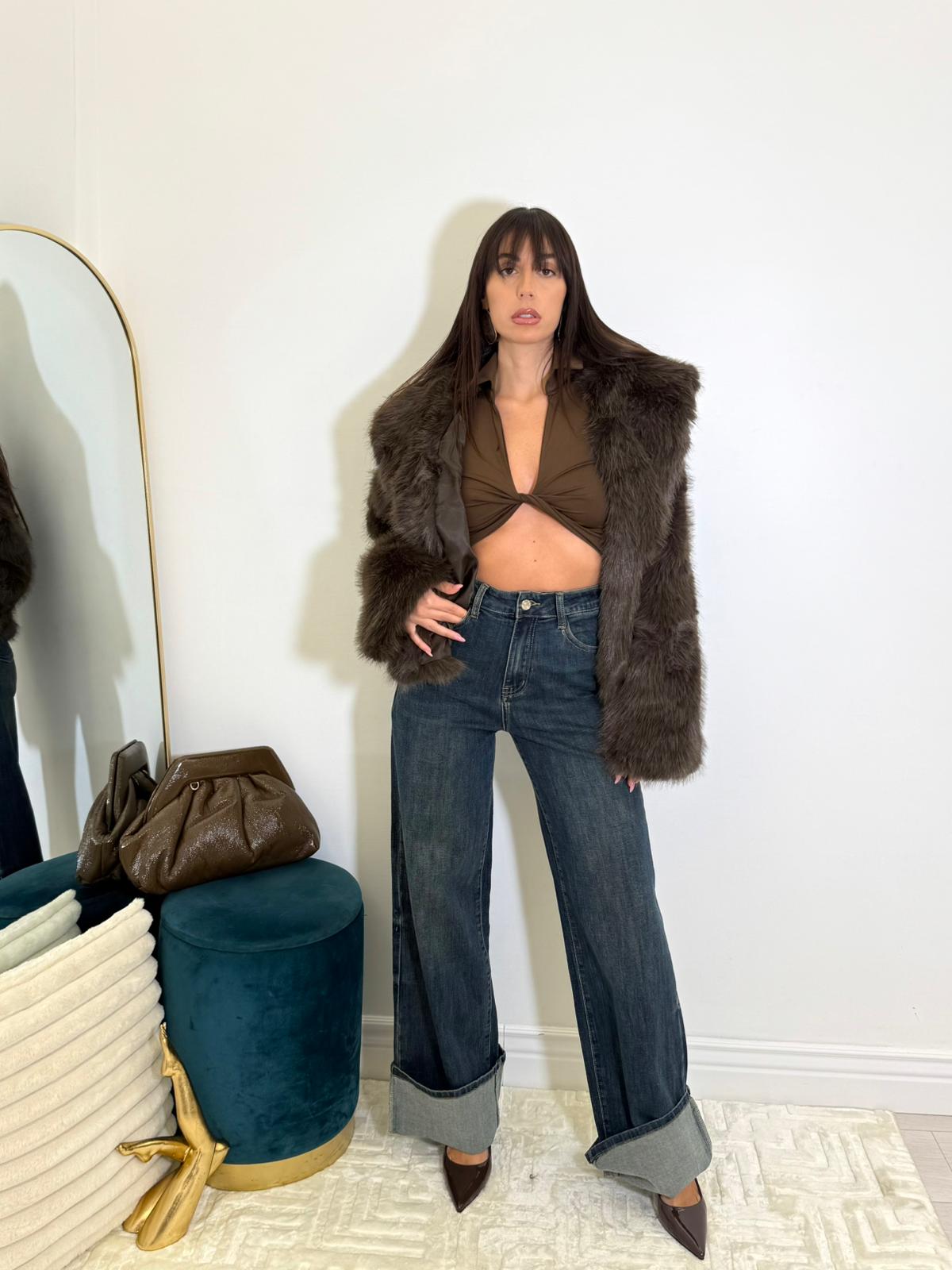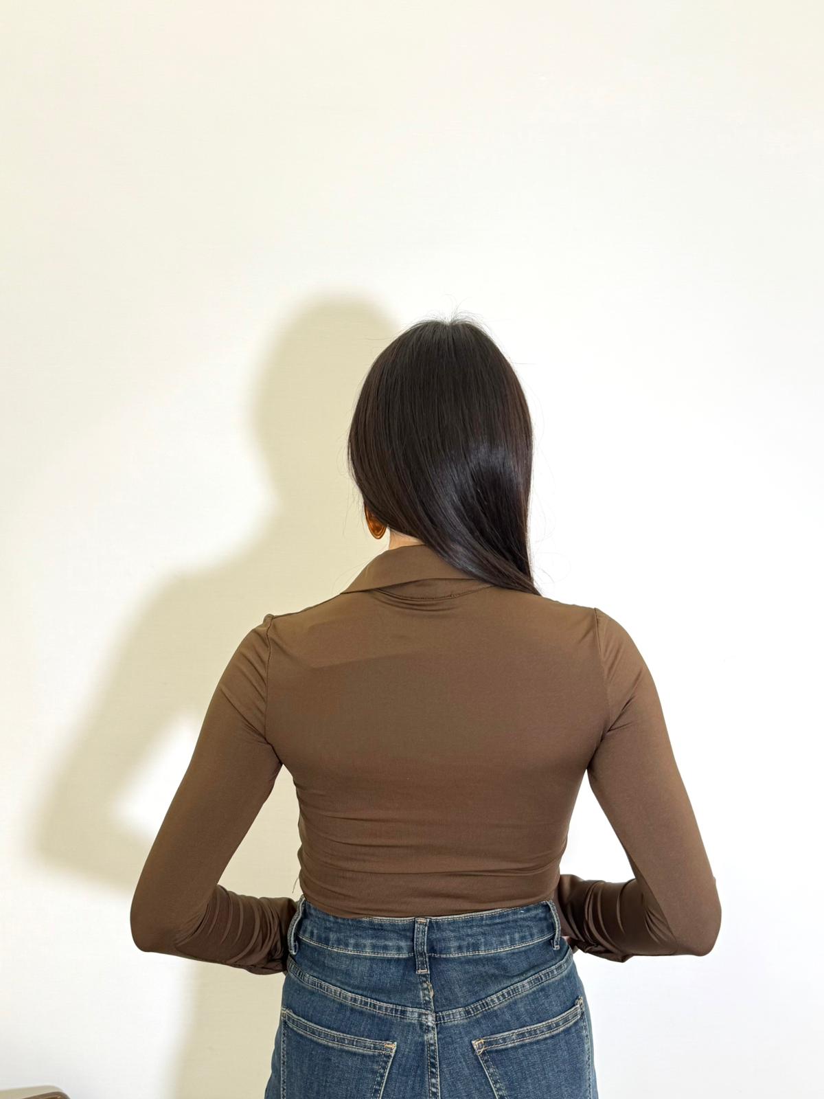 Mglietta crop top in simil cotone elastico con colletto,scollo profondo a V e incrocio sul davanti.