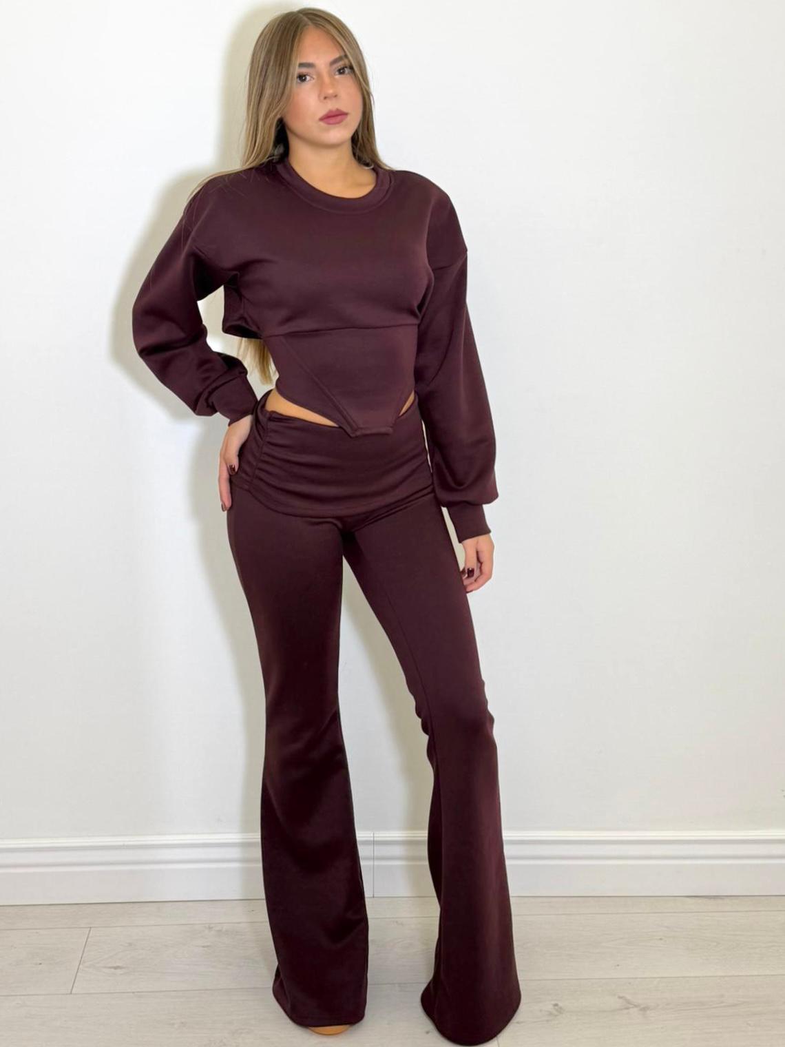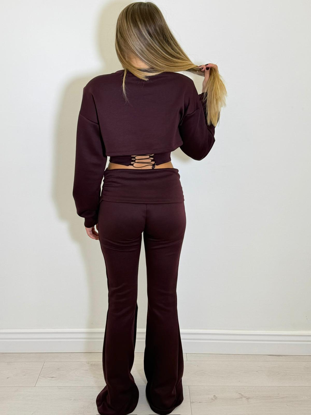 coordinato in cotone , composto da felpa effetto bustier con lacci regolabili sul retro a maniche lunghe e pantalone a zampa, stretto in vita.