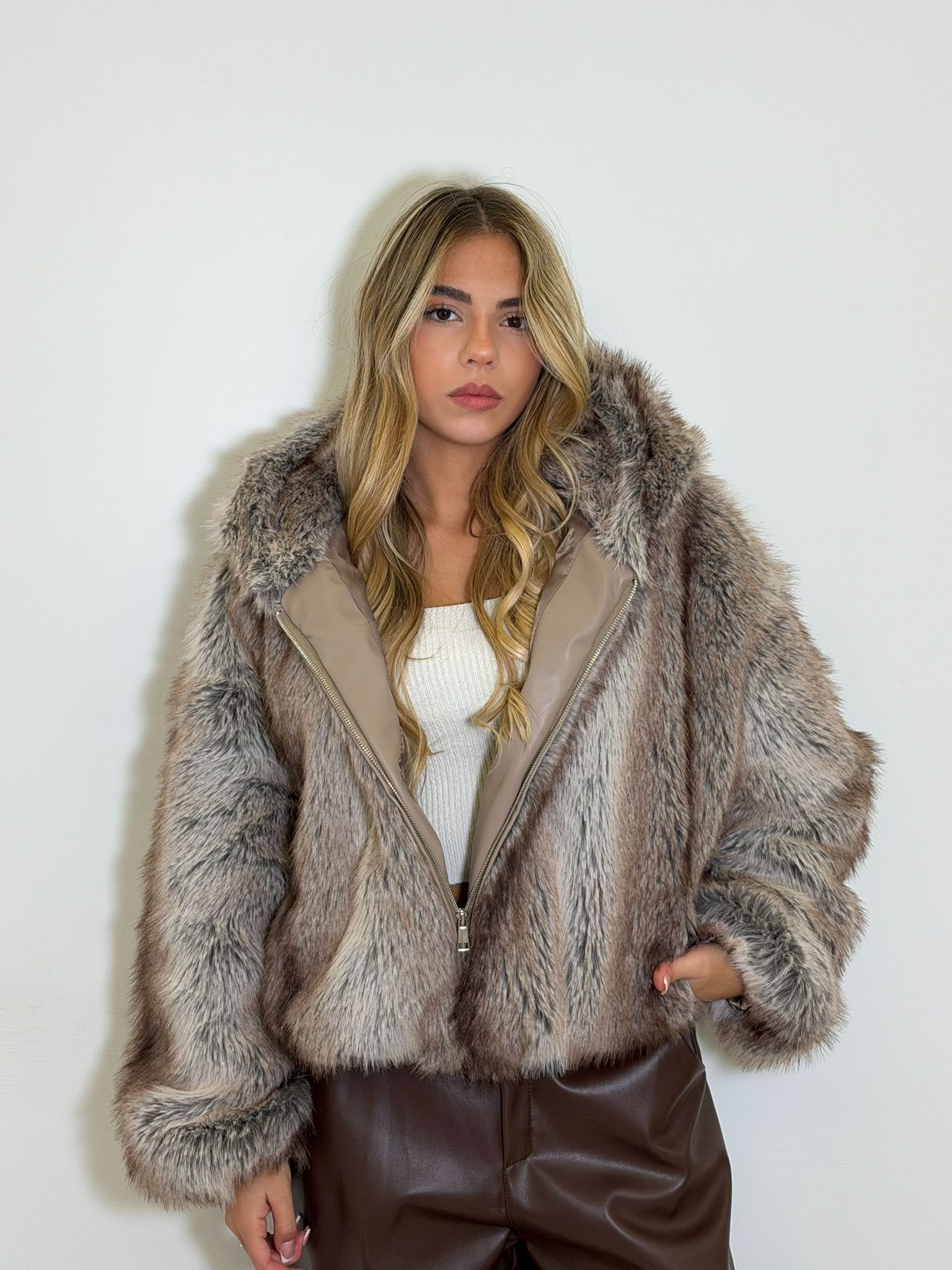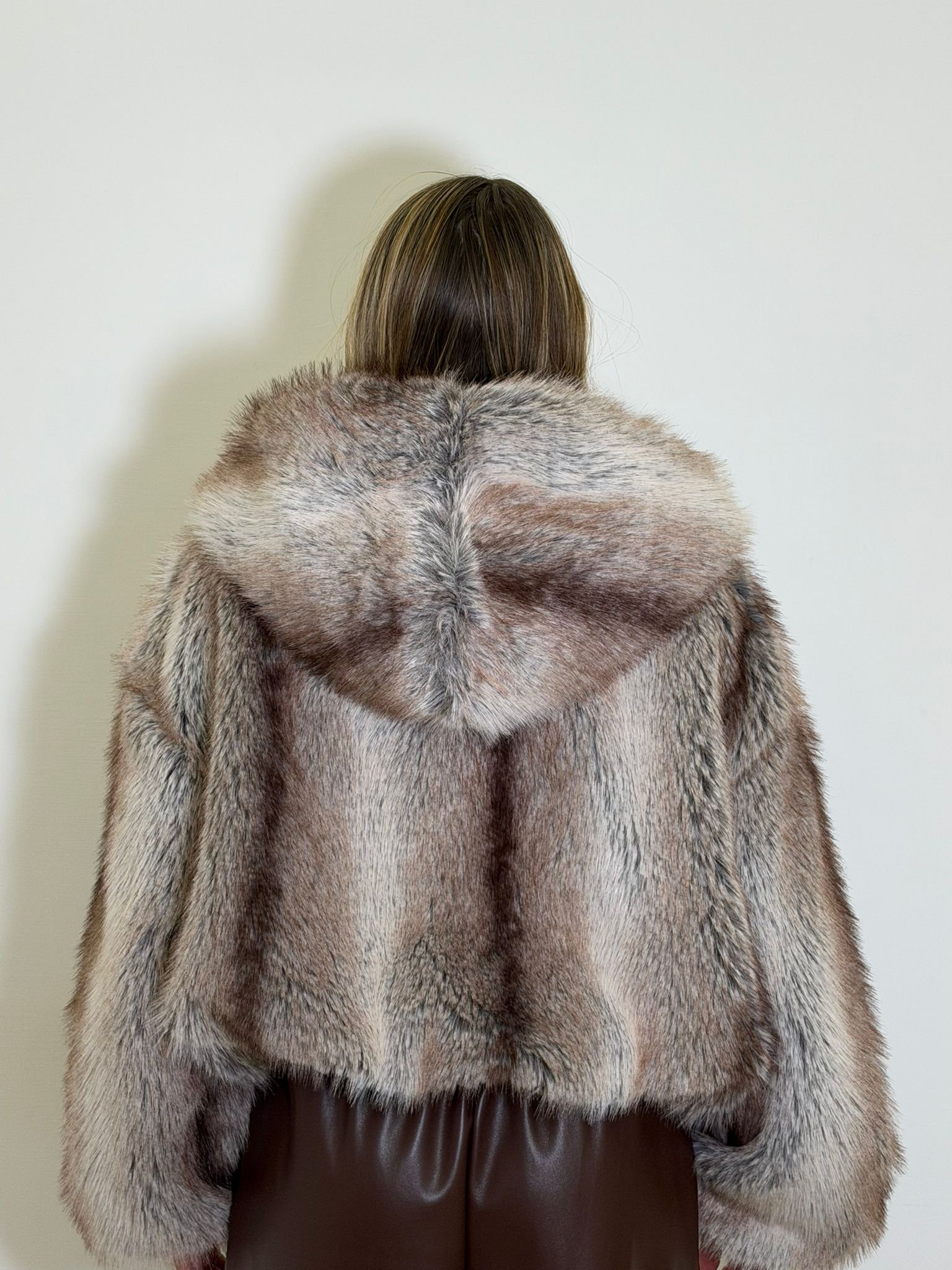 Eco- pelliccia crop a pelo corto sintetico a maniche lunghe con cappuccio e zip.