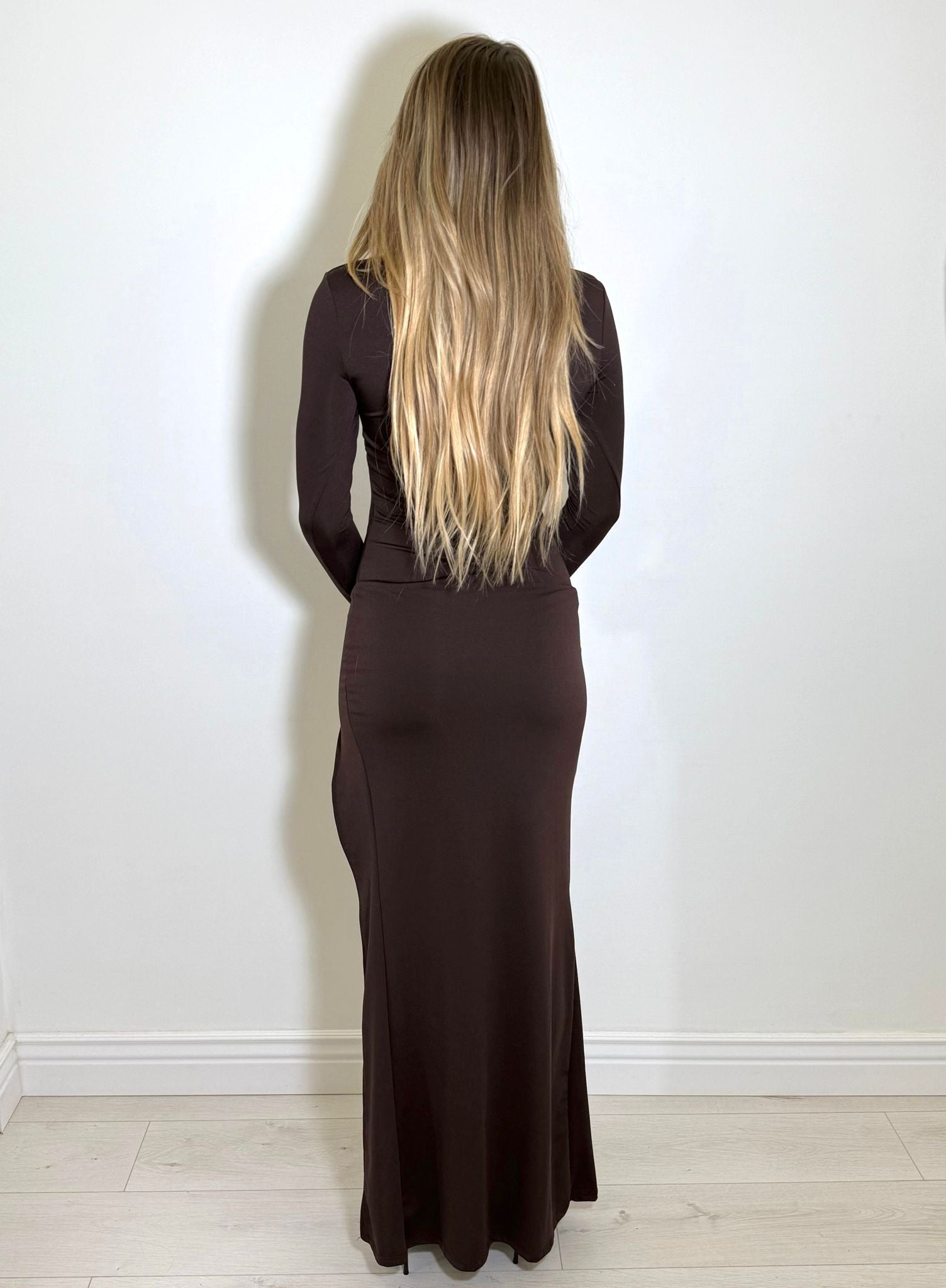 abito in pizzo con bottoni frontali e scollo a cuore .