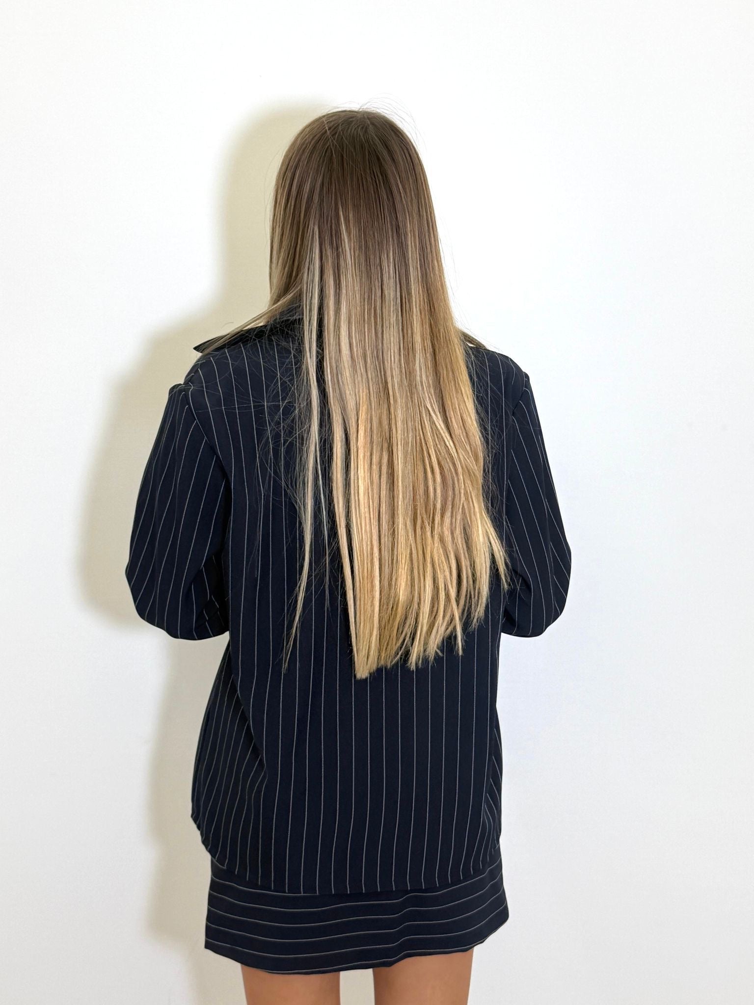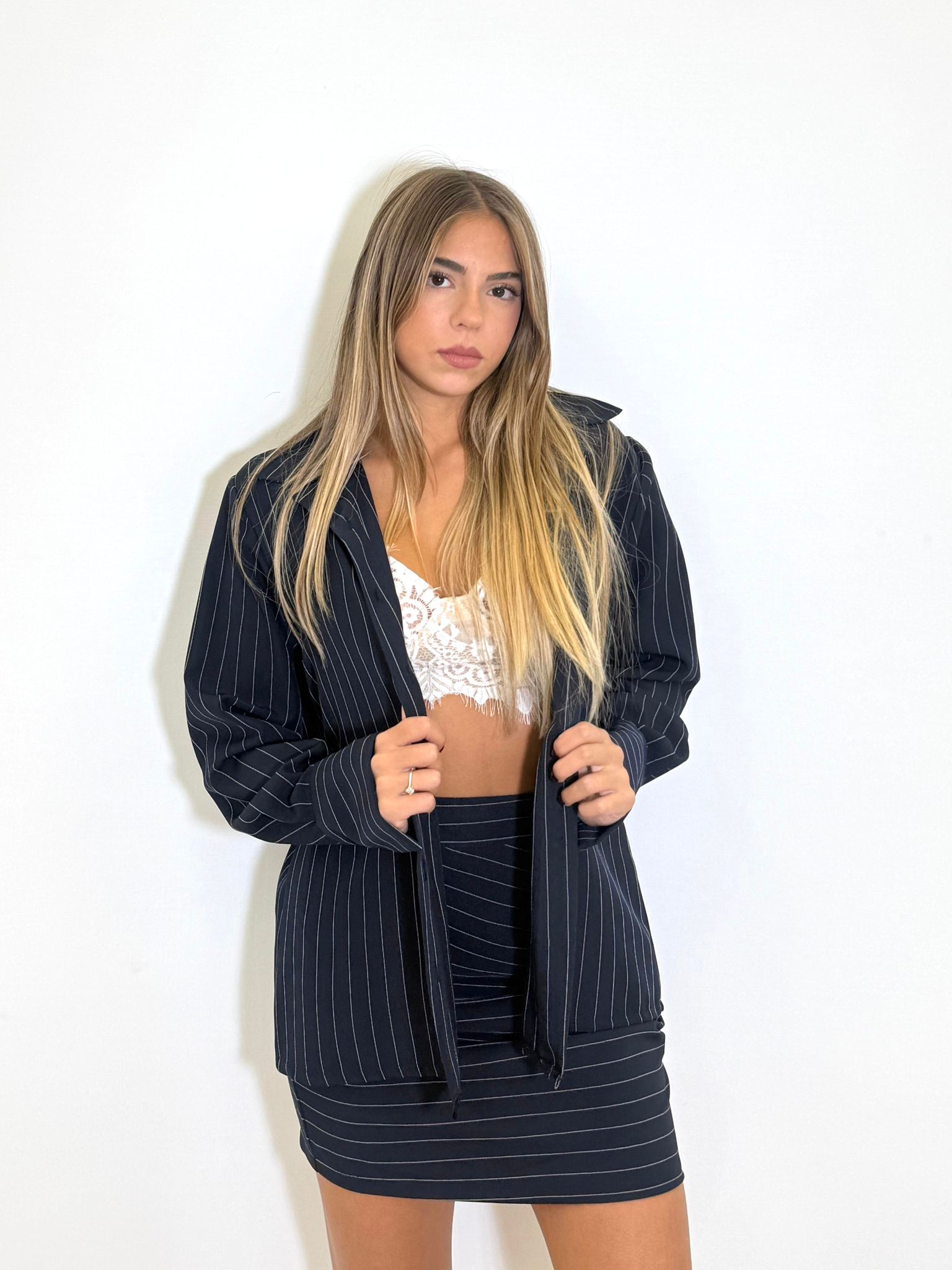 Coordinato due pezzi composto da camicia a righe e gonna.