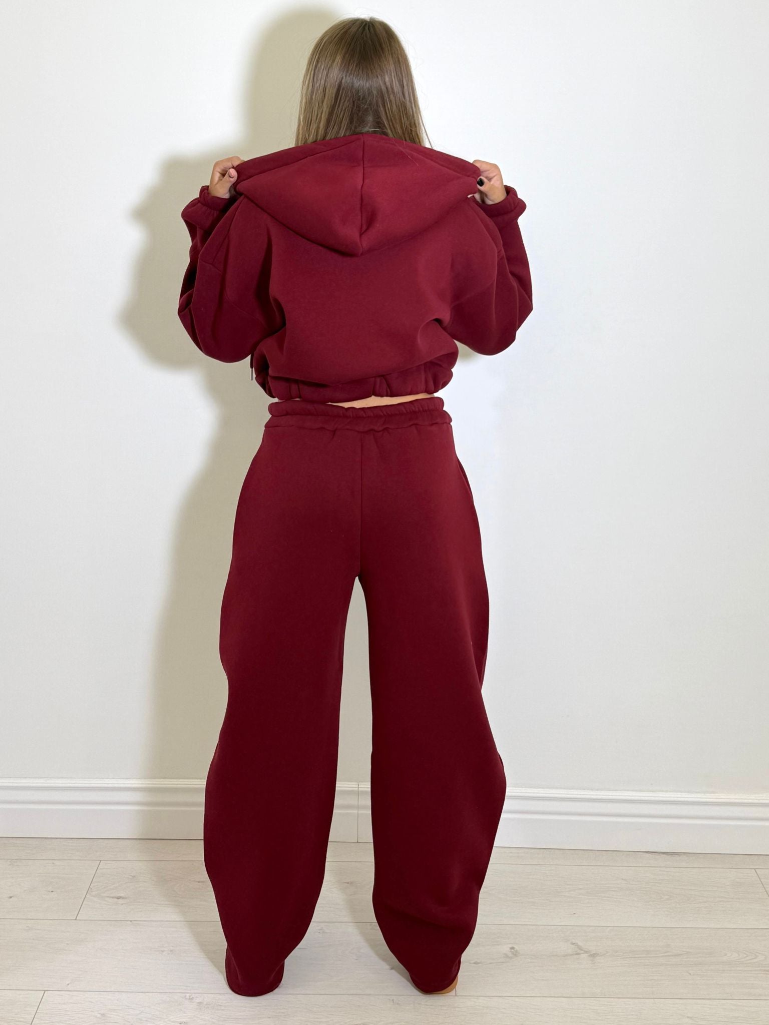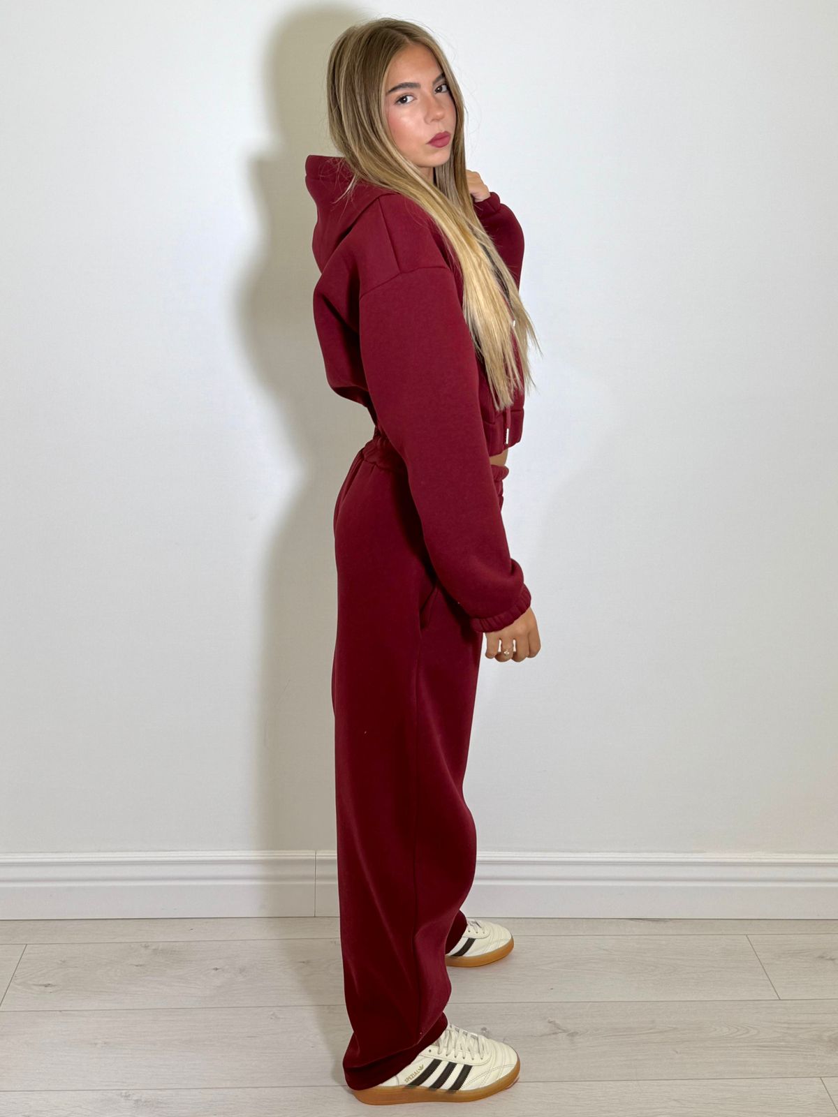 Coordinato in cotone composto da camicia con zip, colletto e maniche a palloncino, pantalone a palazzo con elastico alla caviglia.