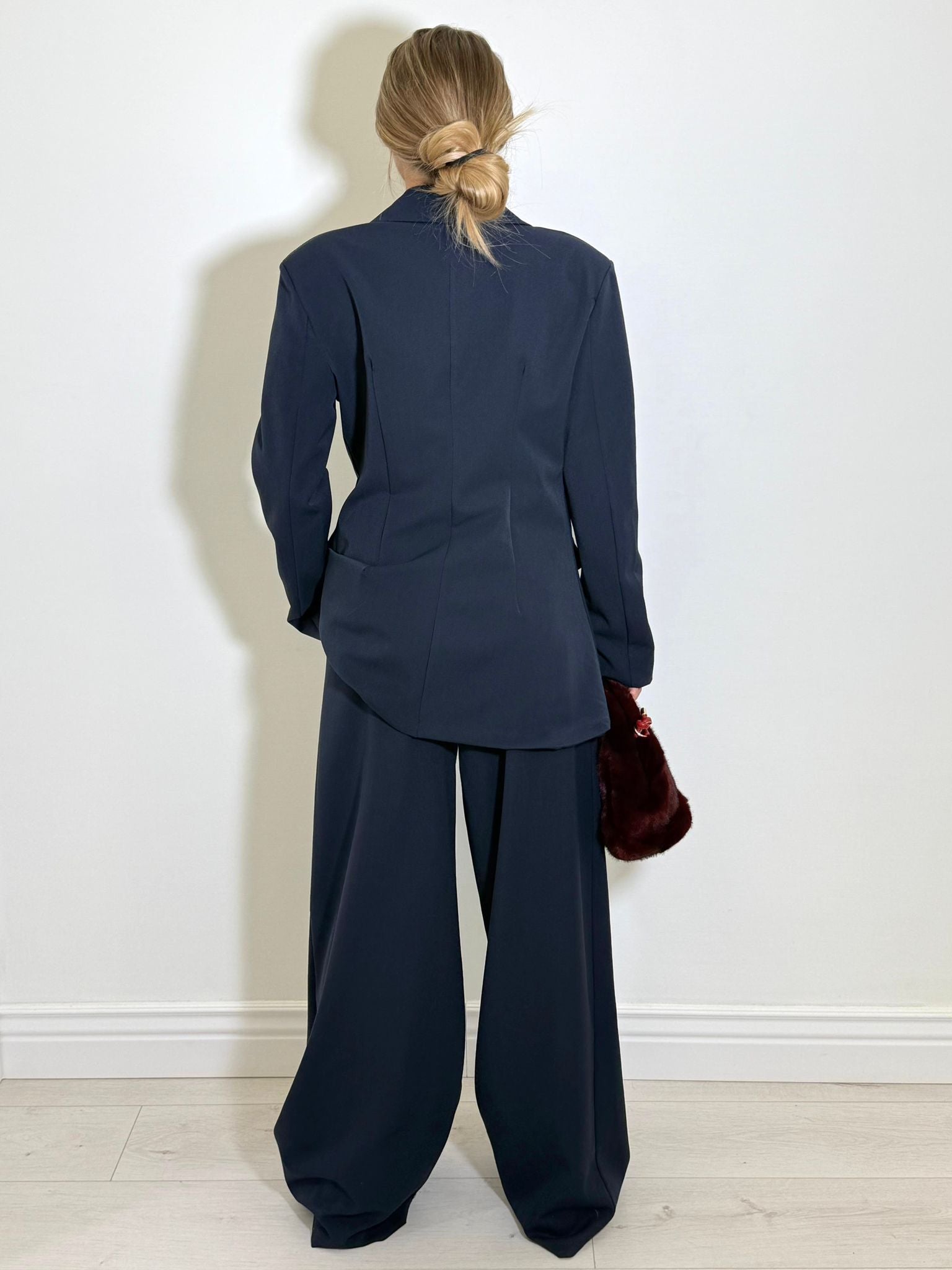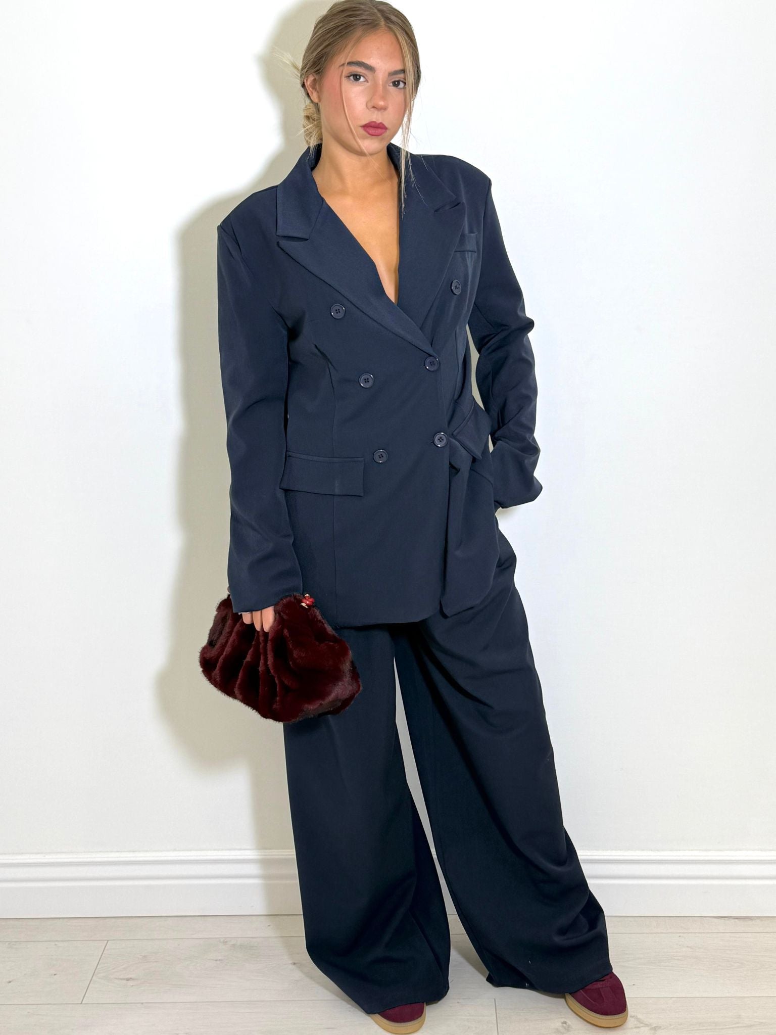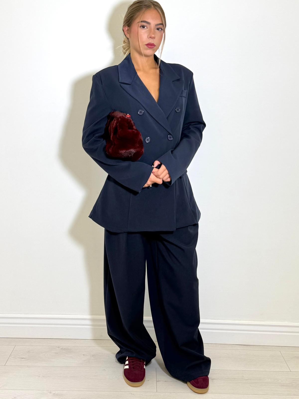 Coordinato in cotone composto da blazer over doppio petto cin bottoncini ,tasche finte e spalline e pantalone palazzo over.