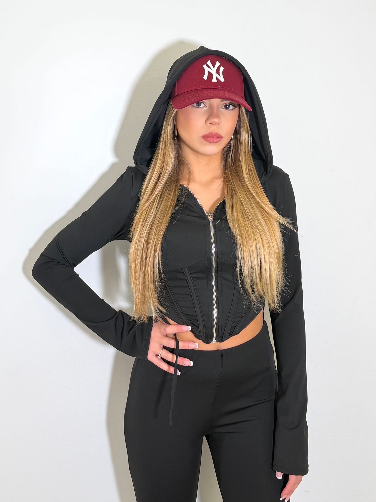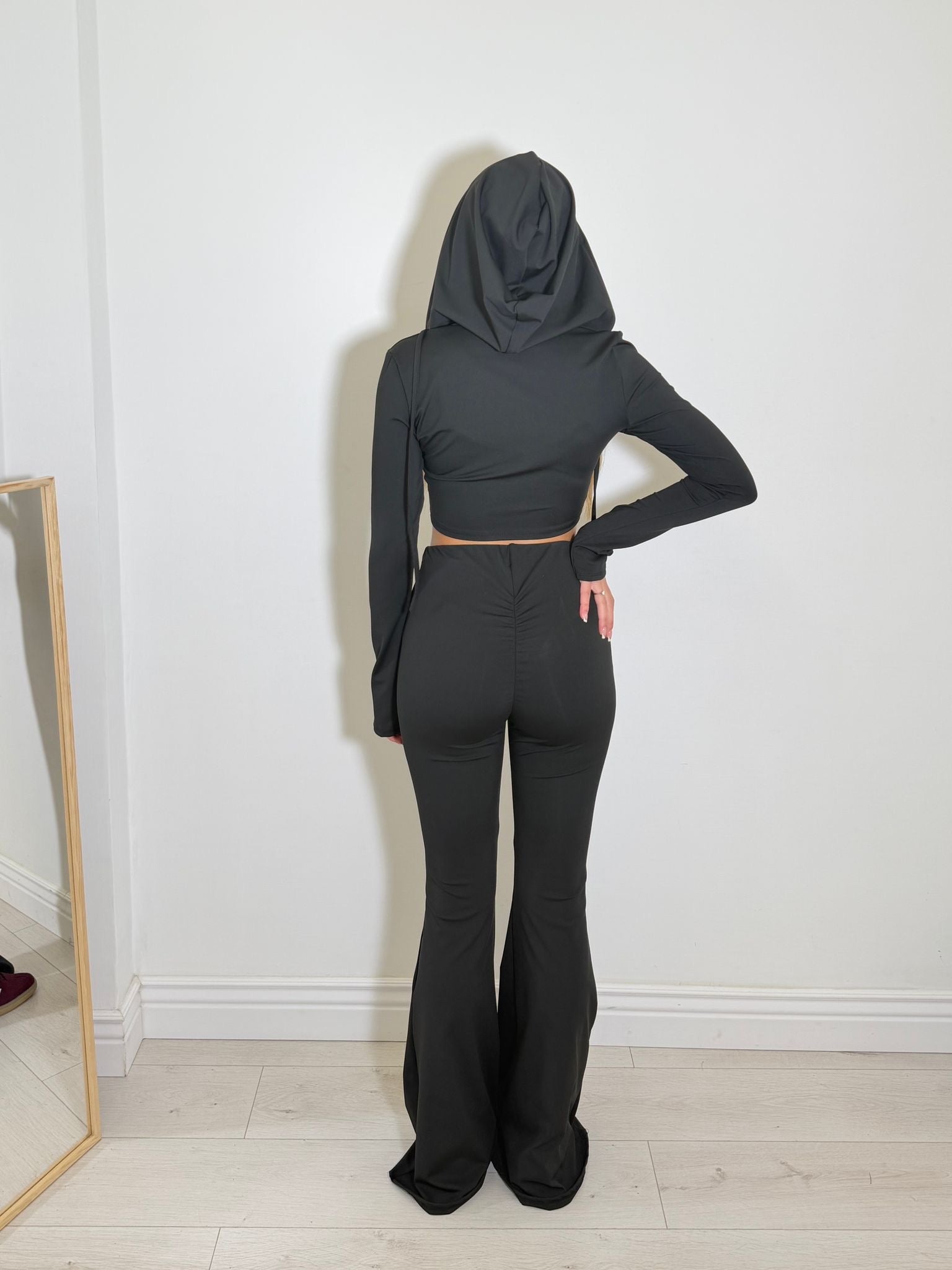cord set in simil cotone composto da felpa crop e pantalone a palazzo push up