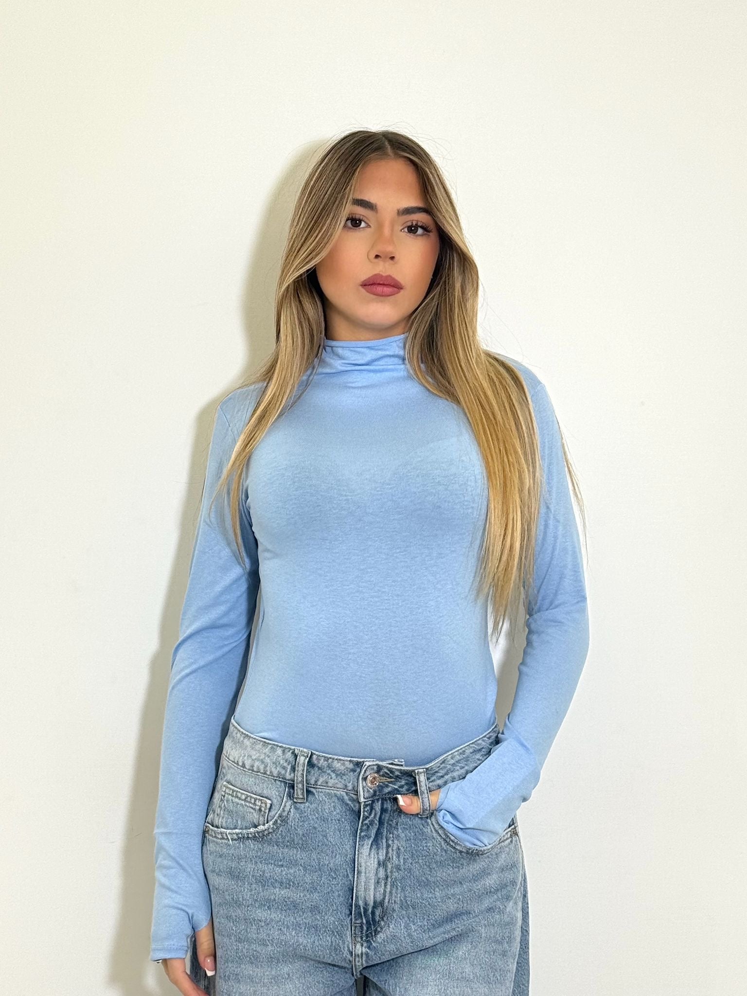 maglia in simil cotone velato collo alto con manica a guanto