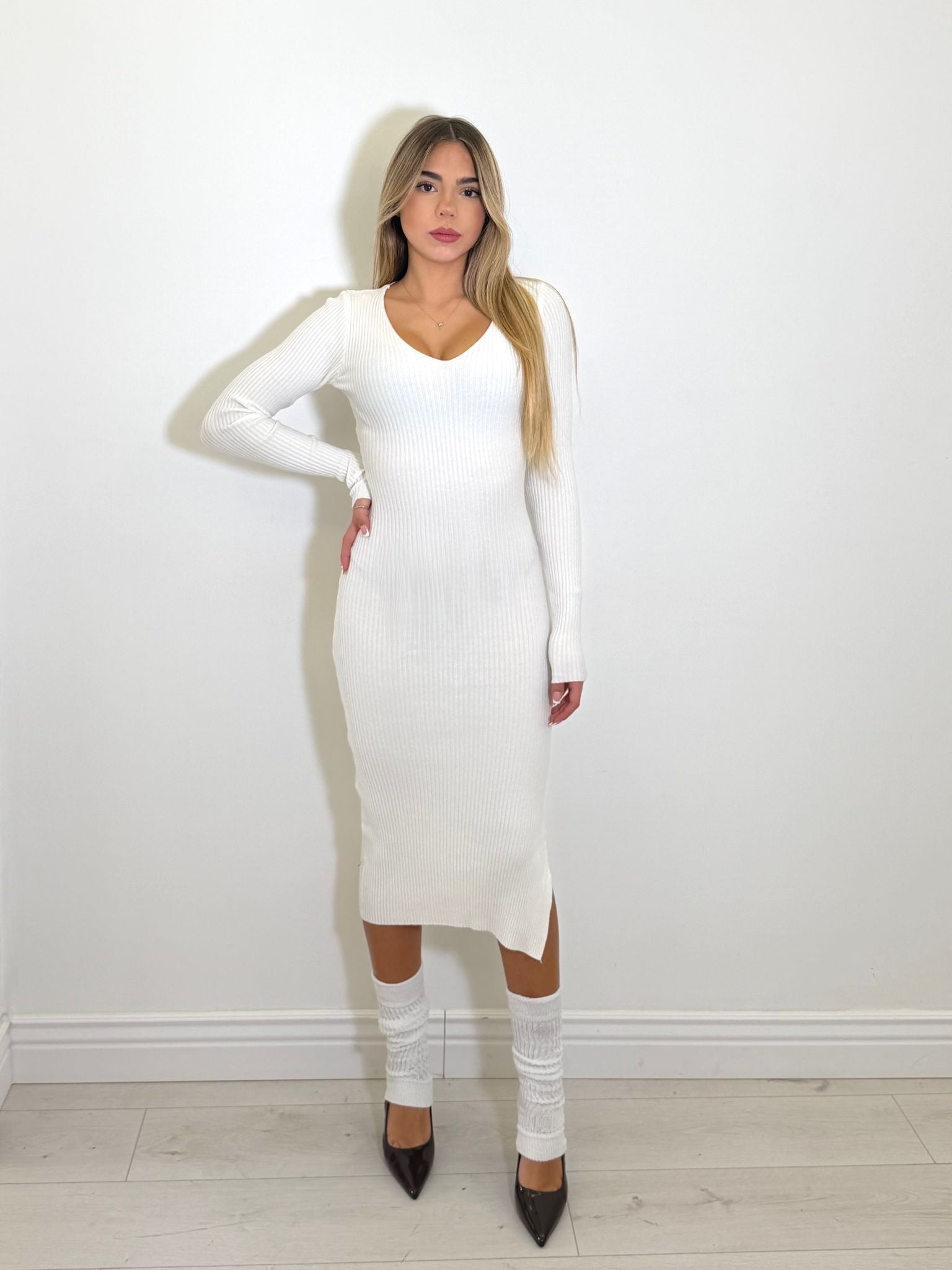 Abito in simil lana rasata scollo a punta con spacco laterale