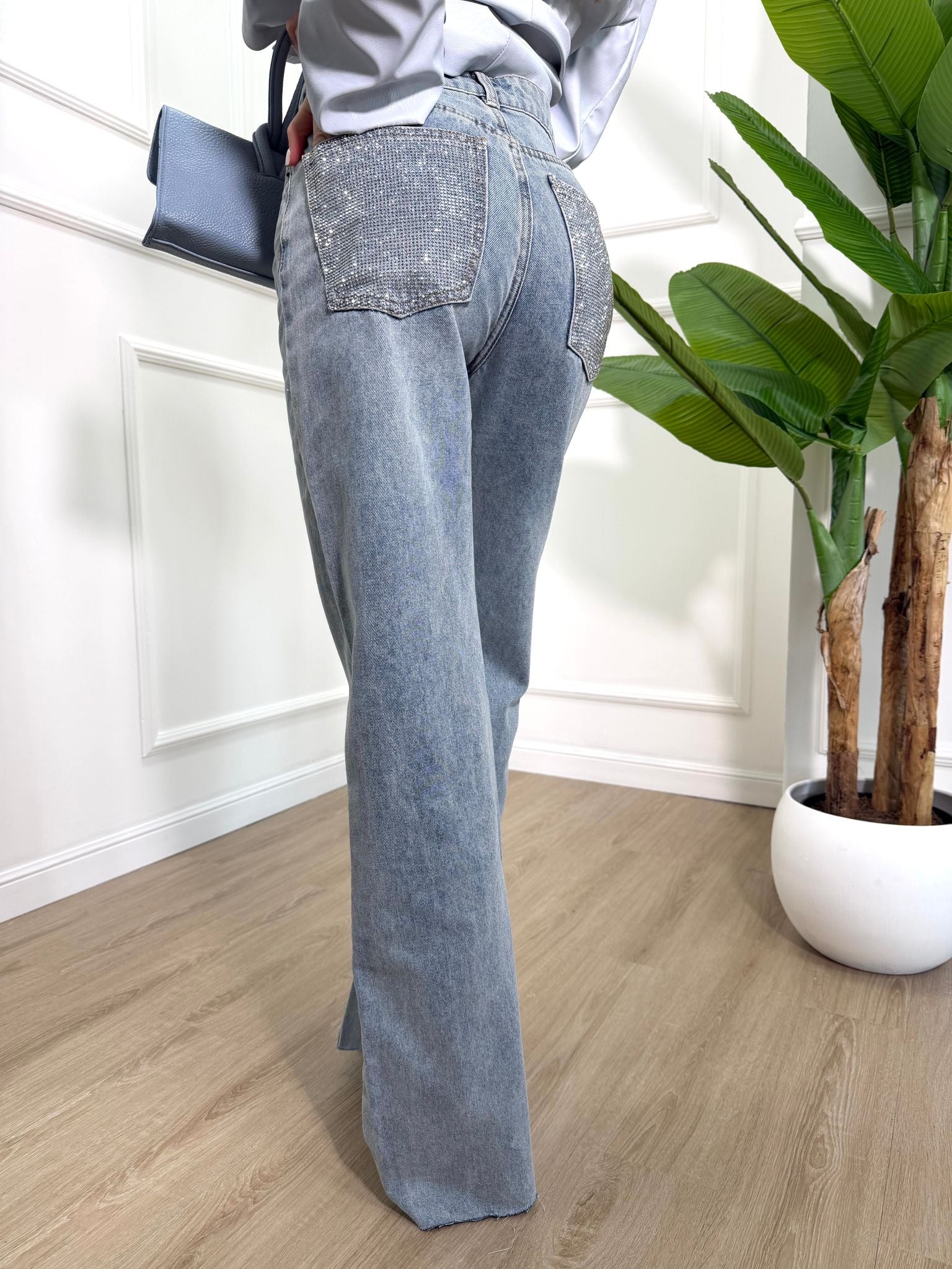 Jeans in tela fissa , tasche con strass , modello palazzo
