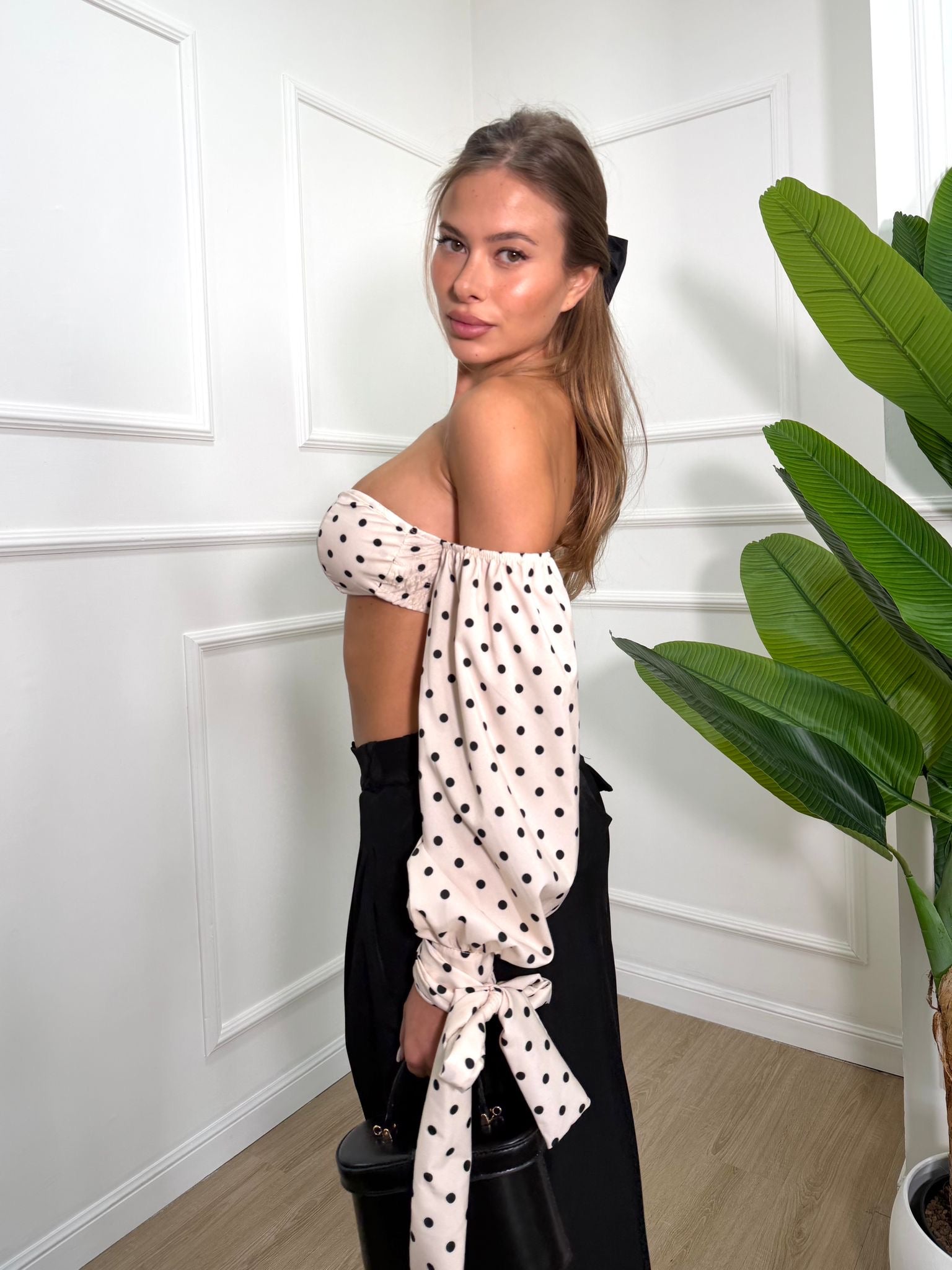 Top con coppe interne , spalline regolabili , scollo a barca , fiocco al polso regolabile , tessuto semi-lucido