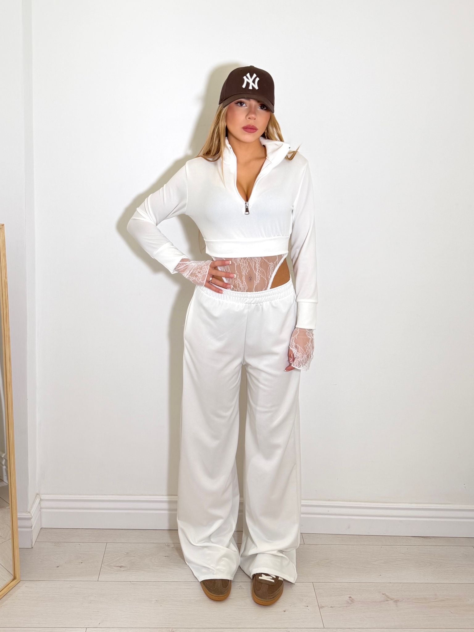 cord set in simil cotone composto da felpa crop dettagli in pizzo modello body e pantalone balloon