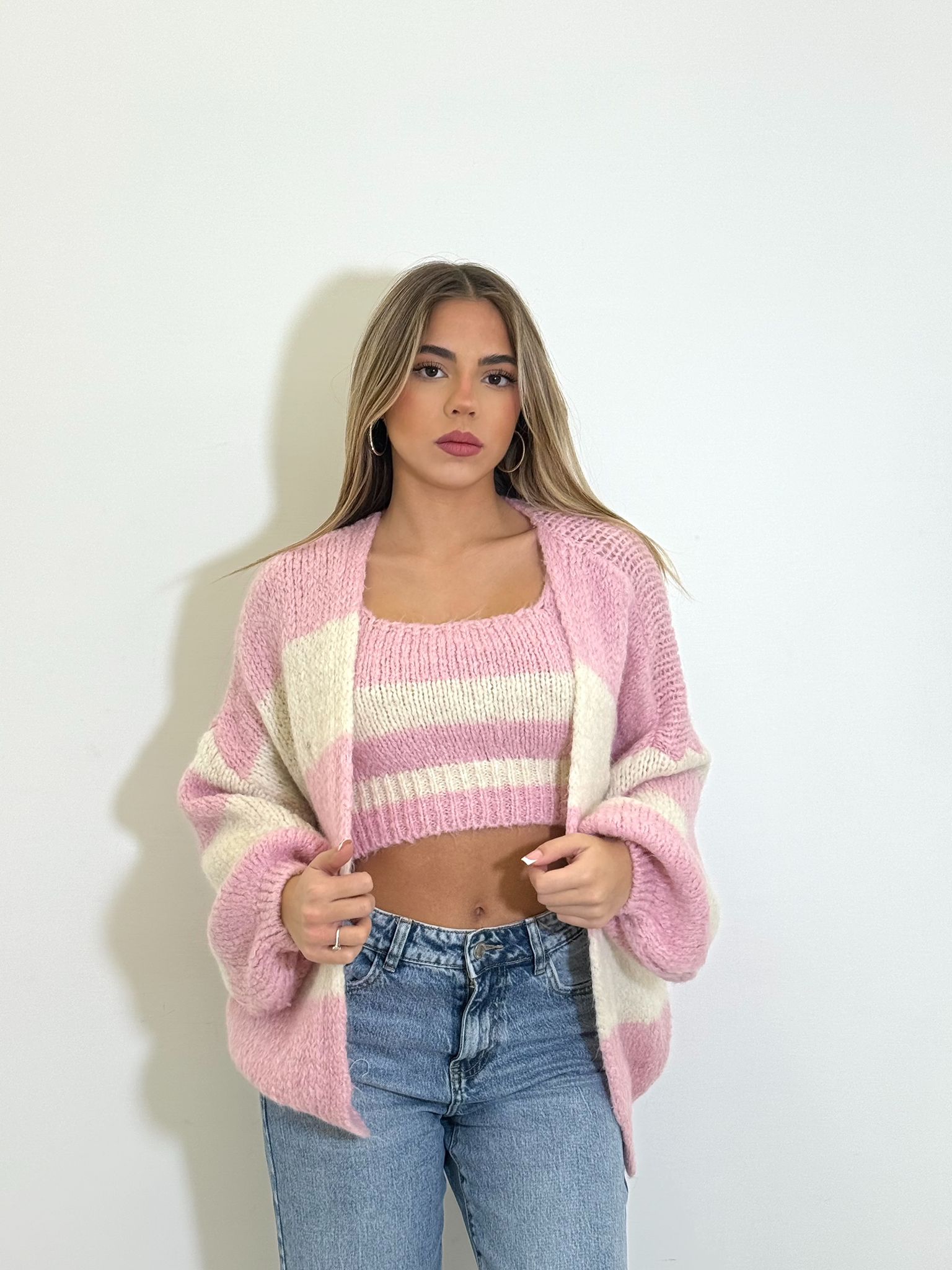 pull in simil lana composto da top crop con spalline sottili e cardigan over.