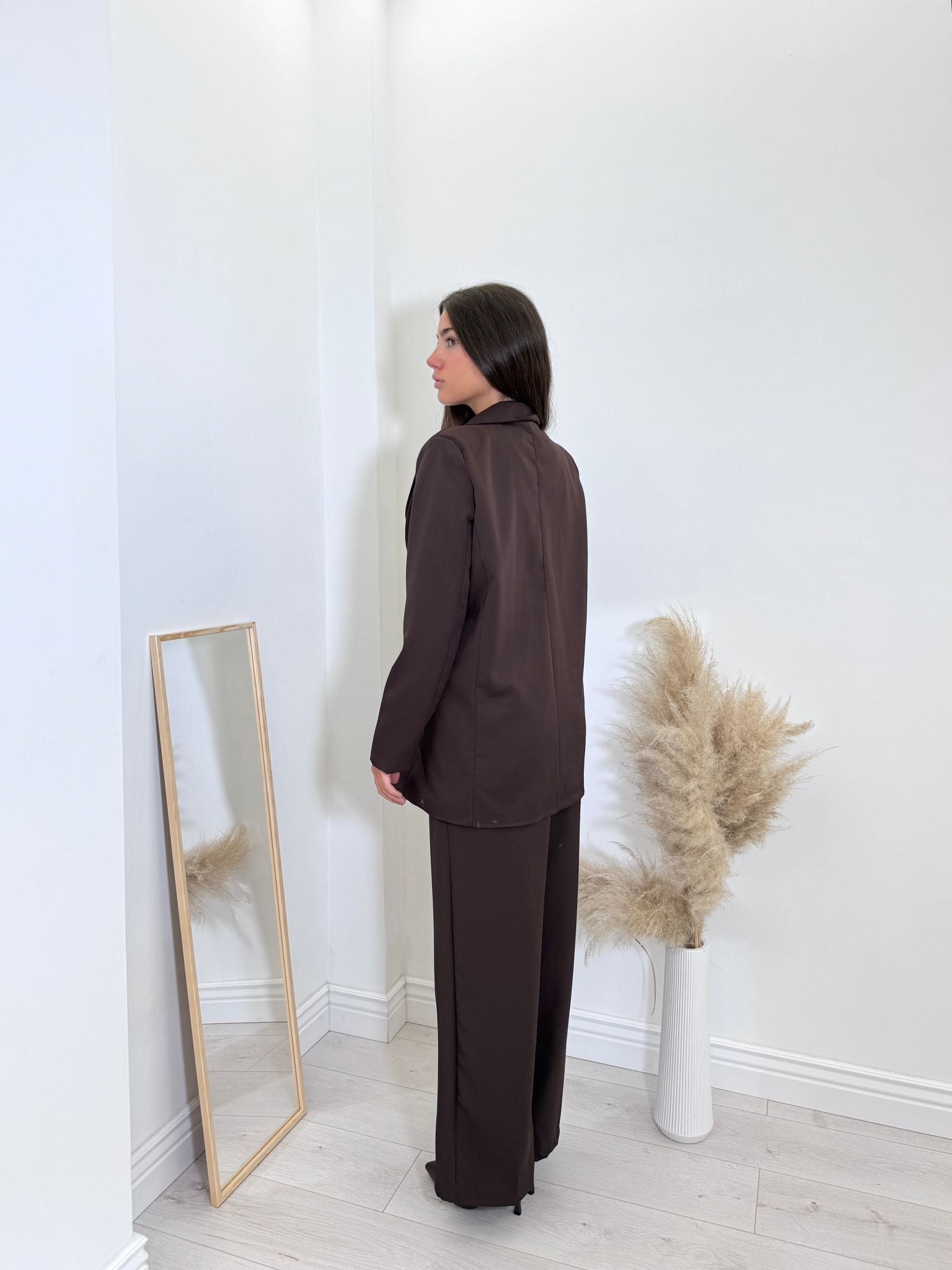 Tailleur in cotone composto da blazer over doppi bottoni e tasche finte, pantalone a palazzo over con bottone in vita.