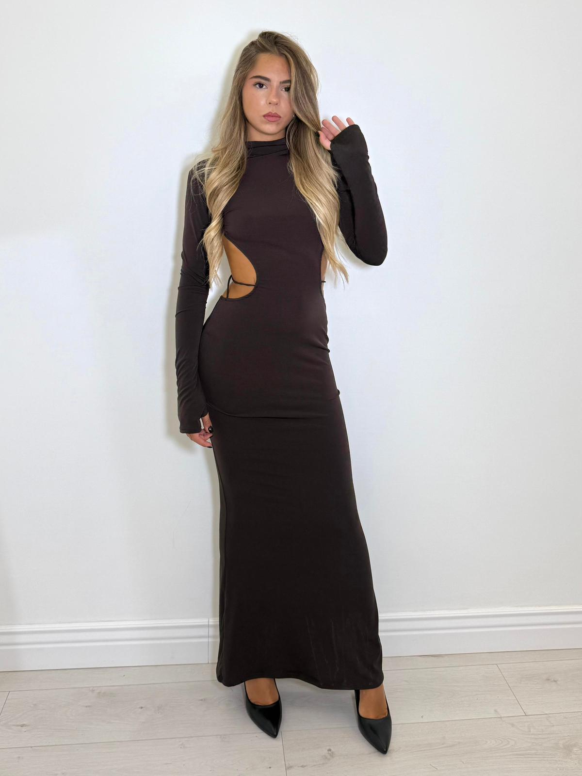 Abito lungo aderente con cut-out laterali, maniche lunghe, schiena scoperta e intreccio anteriore.
