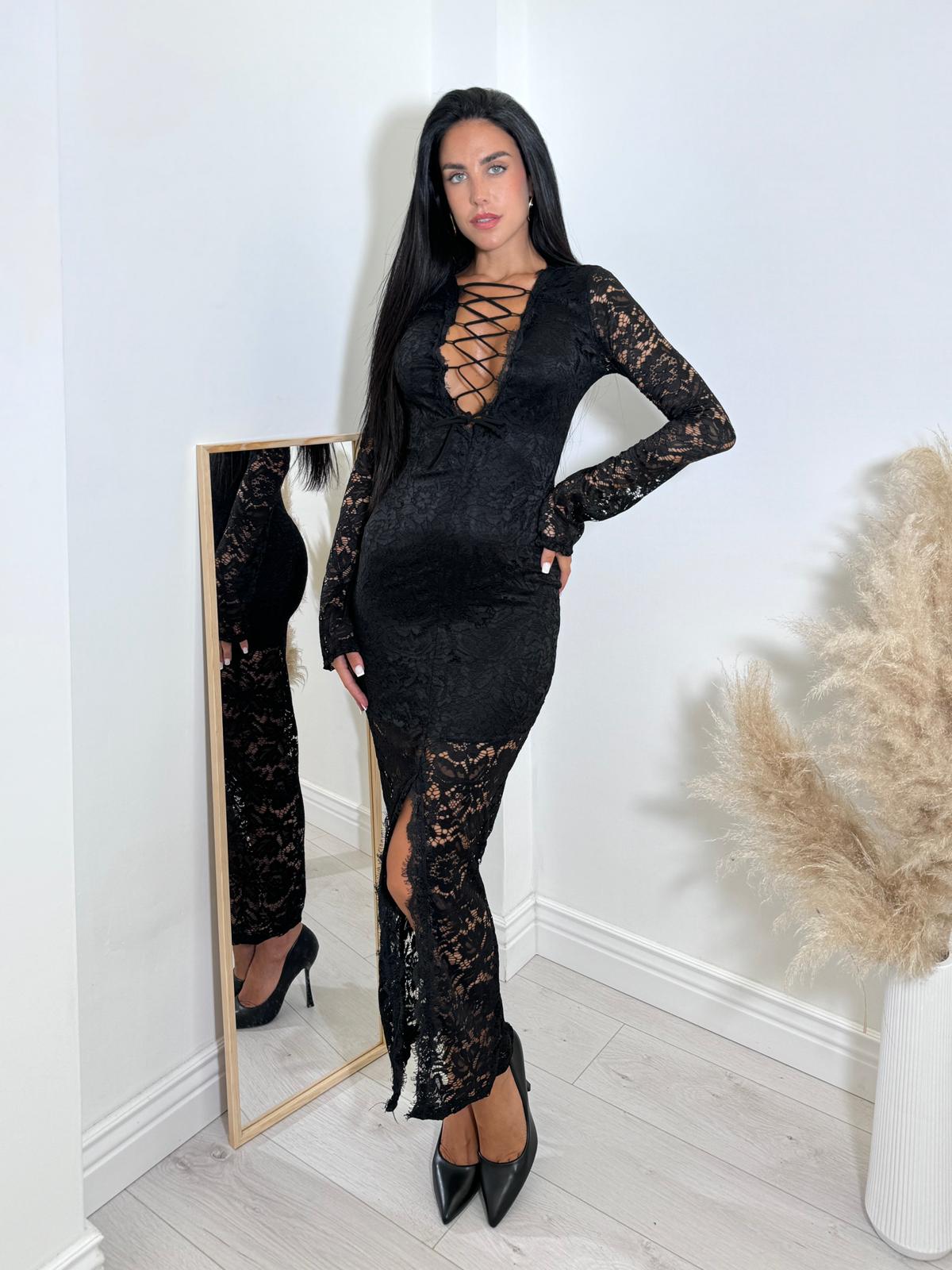 Abito lungo in pizzo, maniche lunghe over, con incroci sul petto, spacco centrale e parte bassa velata.