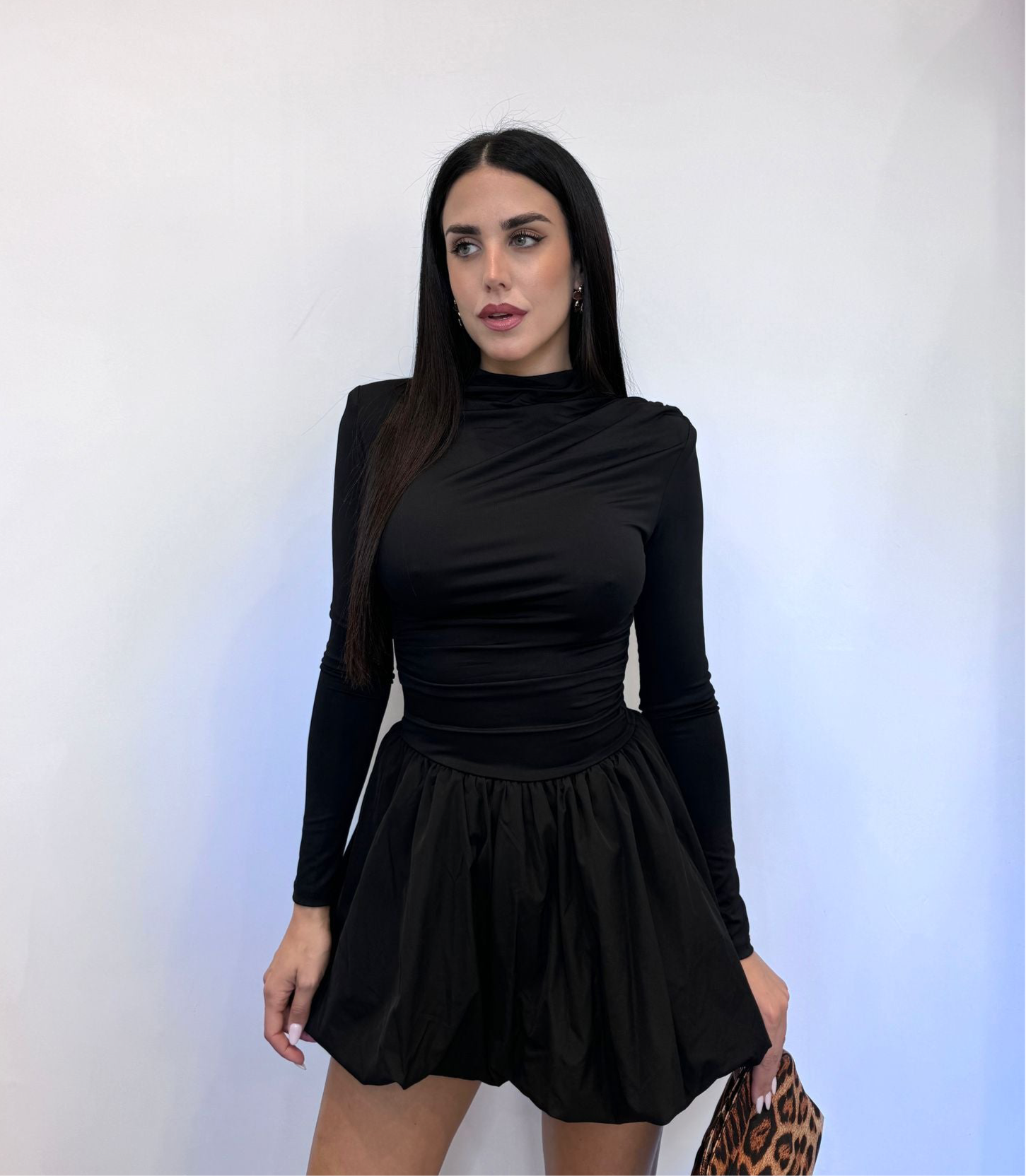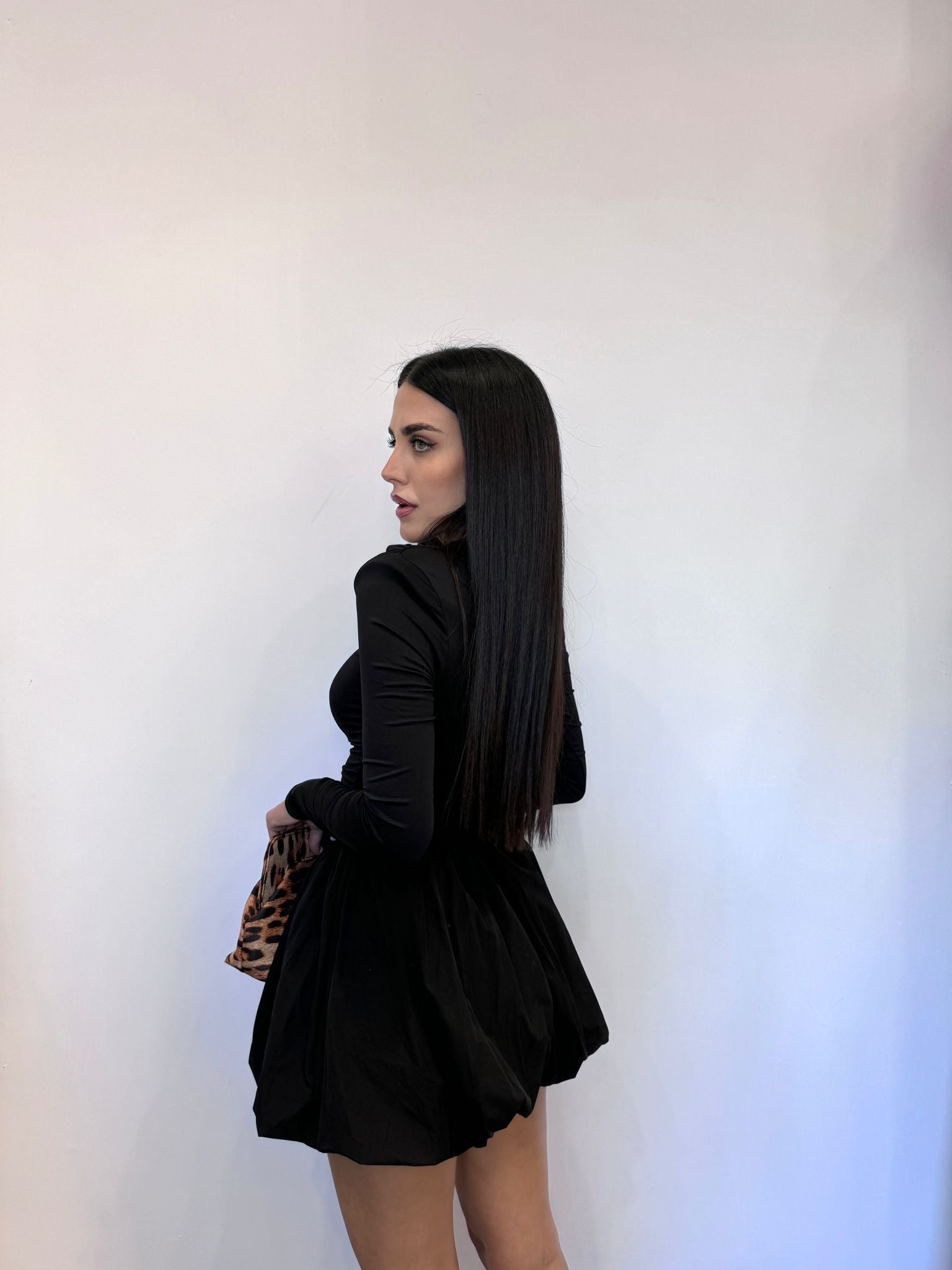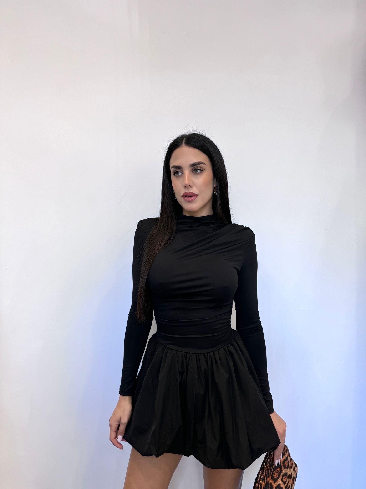 Abito in tessuto elastico con gonna ballon in cotone, maniche lunghe, spalline rinforzate.
