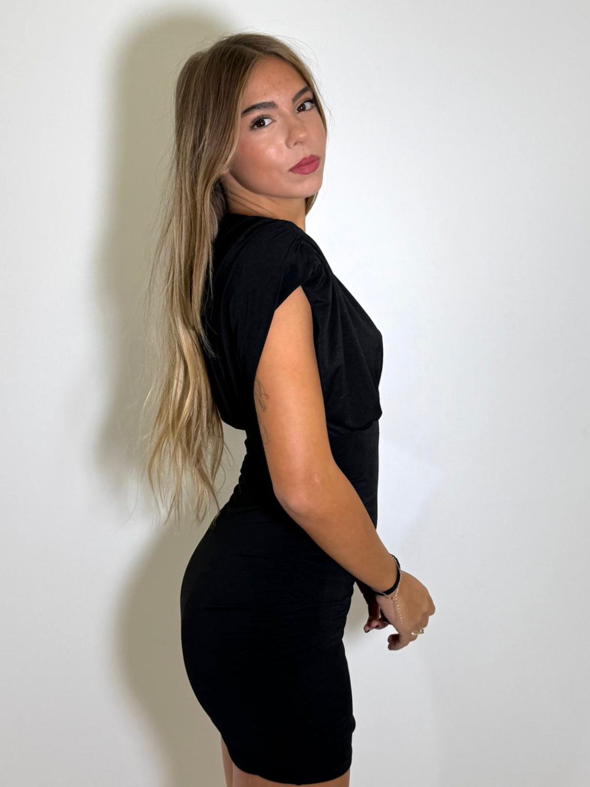 abito in tessuto elasticizzato con spalle strutturate e scollo a V.