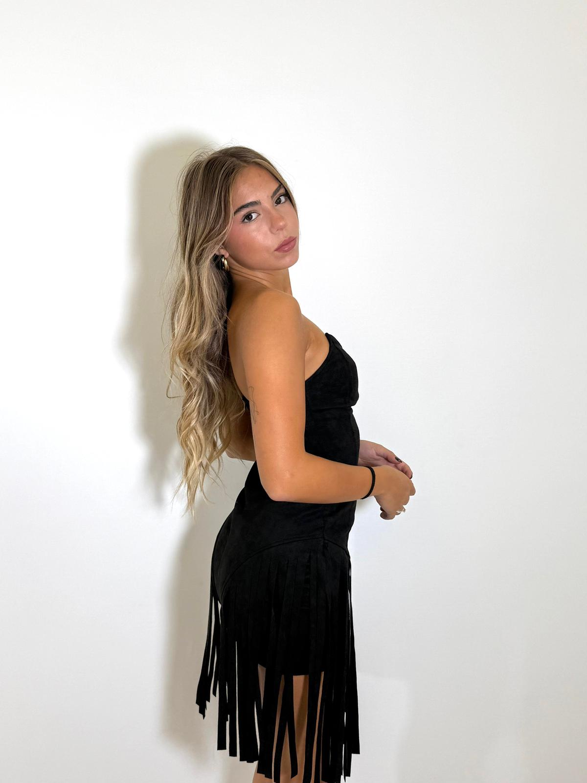 abito in tessuto scamosciato con corpetto aderente e frange sul fondo.