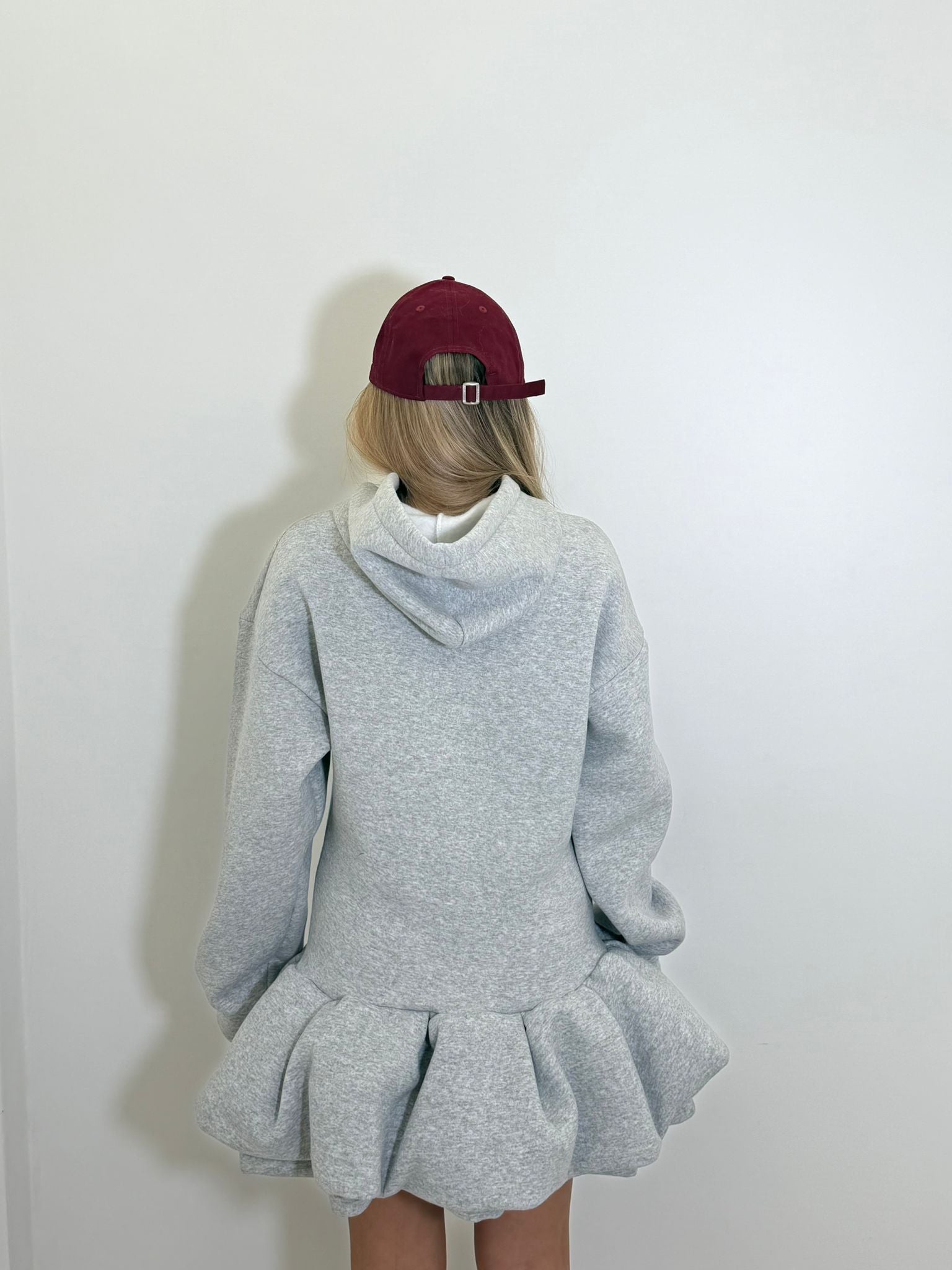 Abito in simil cotone doppio, modello felpa over, imbottito, con balze.