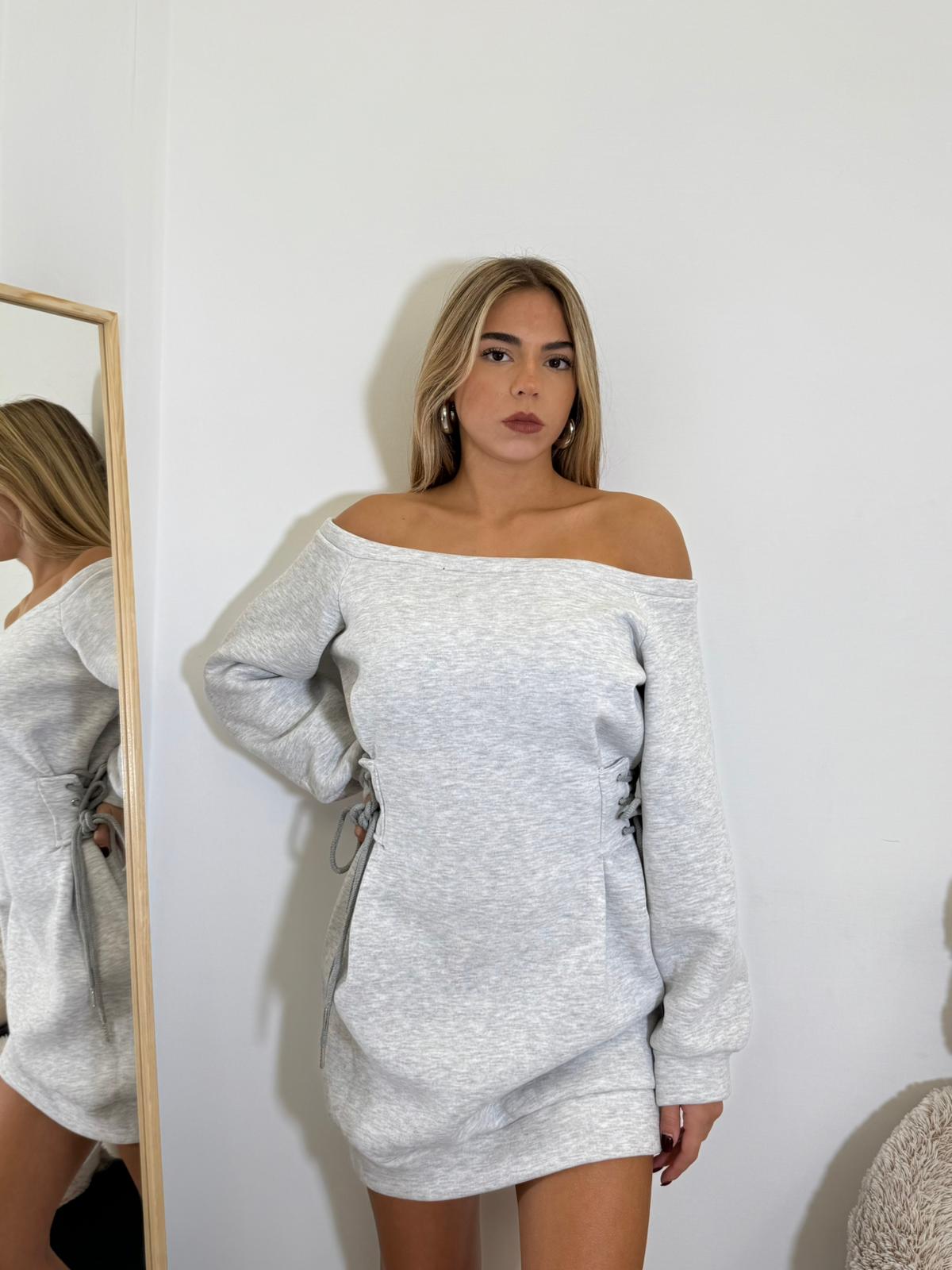 Abito felpa con lacci sui lati per evidenziare il punto vita.