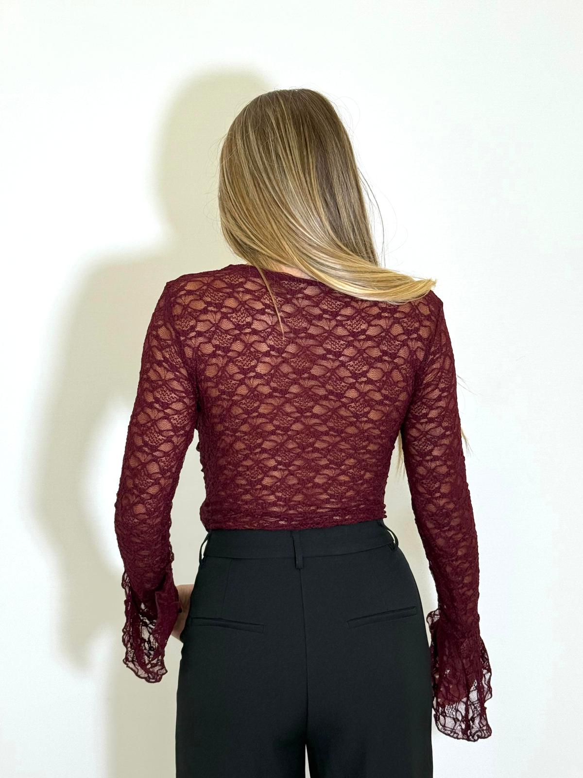 body realizzato in pizzo con dettagli trasparenti, scollo profondo.