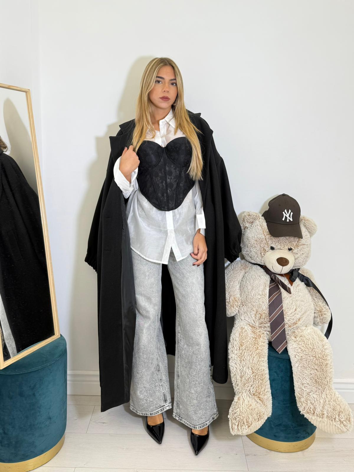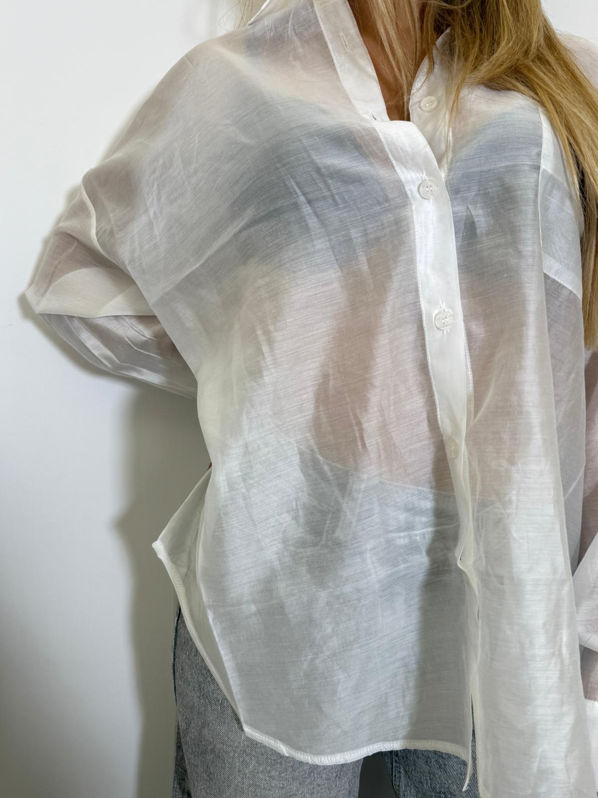 Camicia over in simil cotone velata, con bottoncini frontali, maniche regolabili.