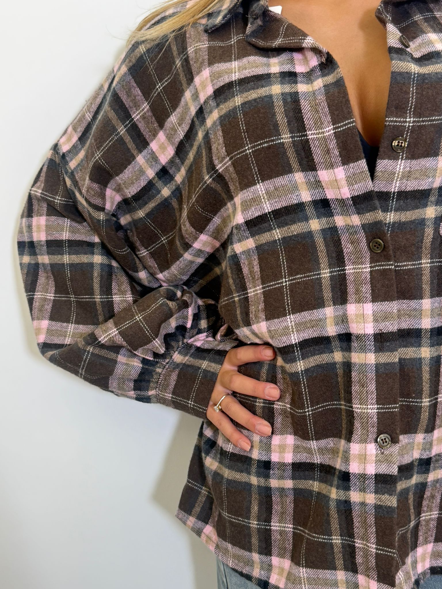 Camicia in simil cotone duro, over, trama a quadri e maniche balloon.