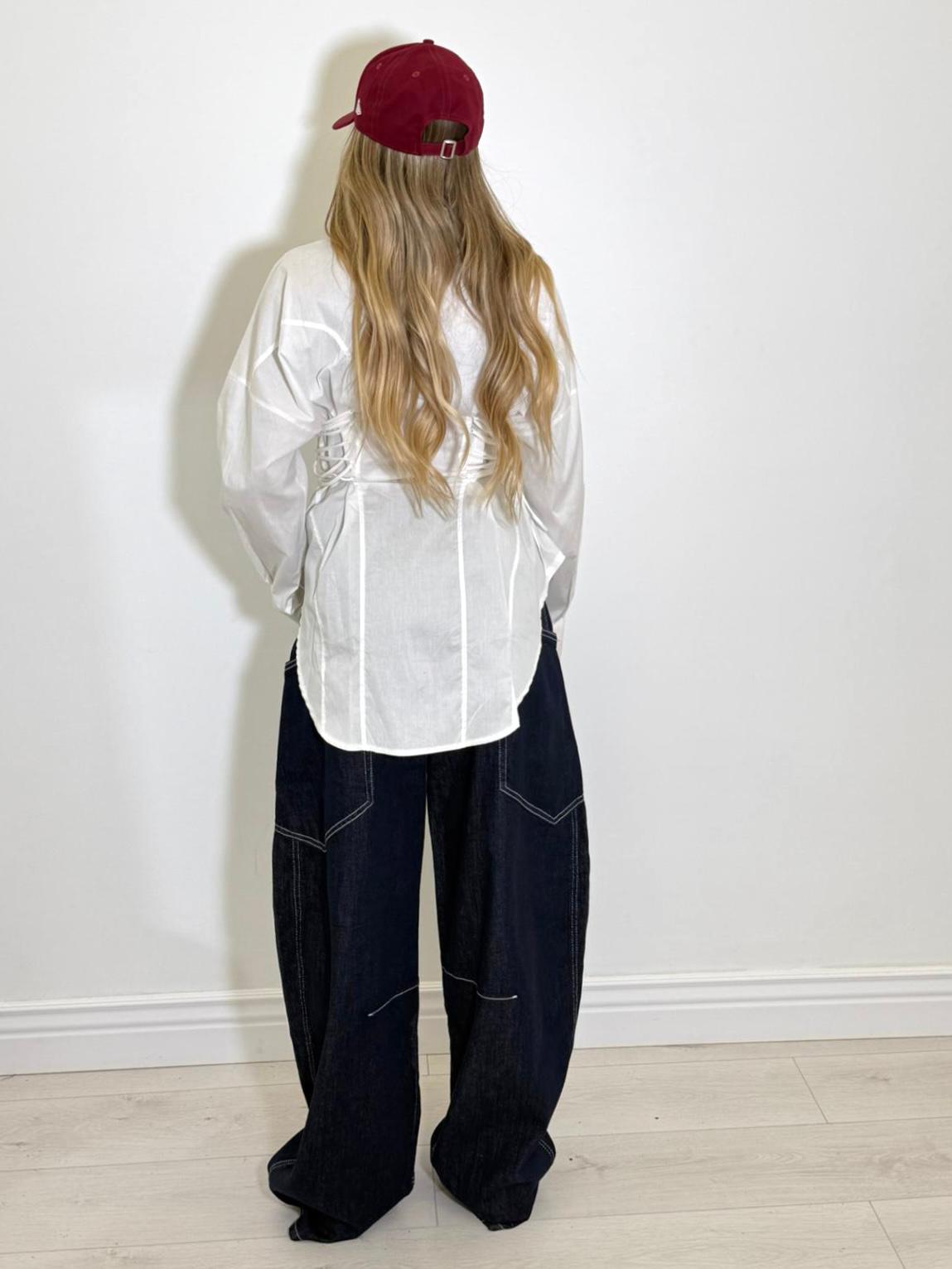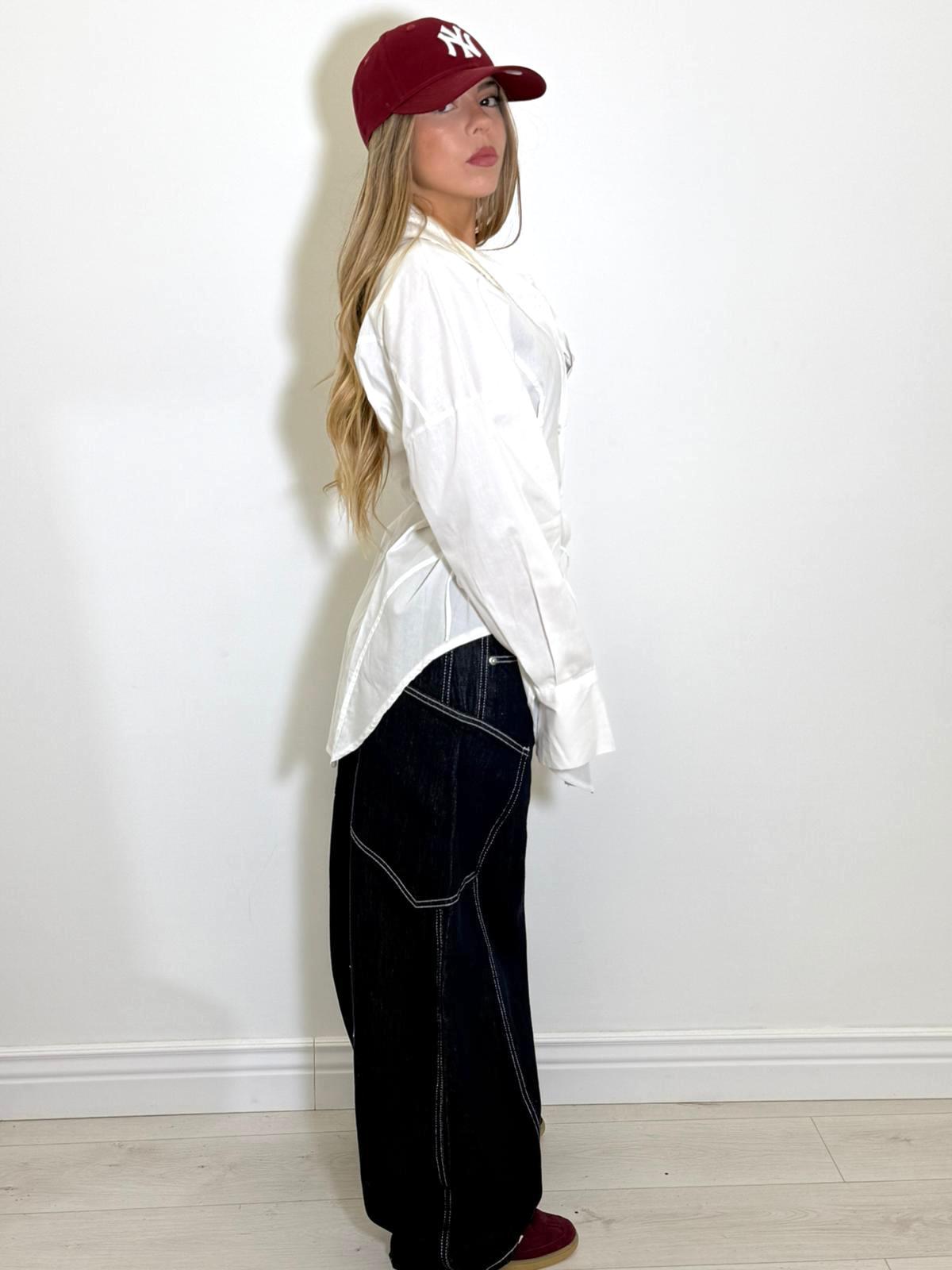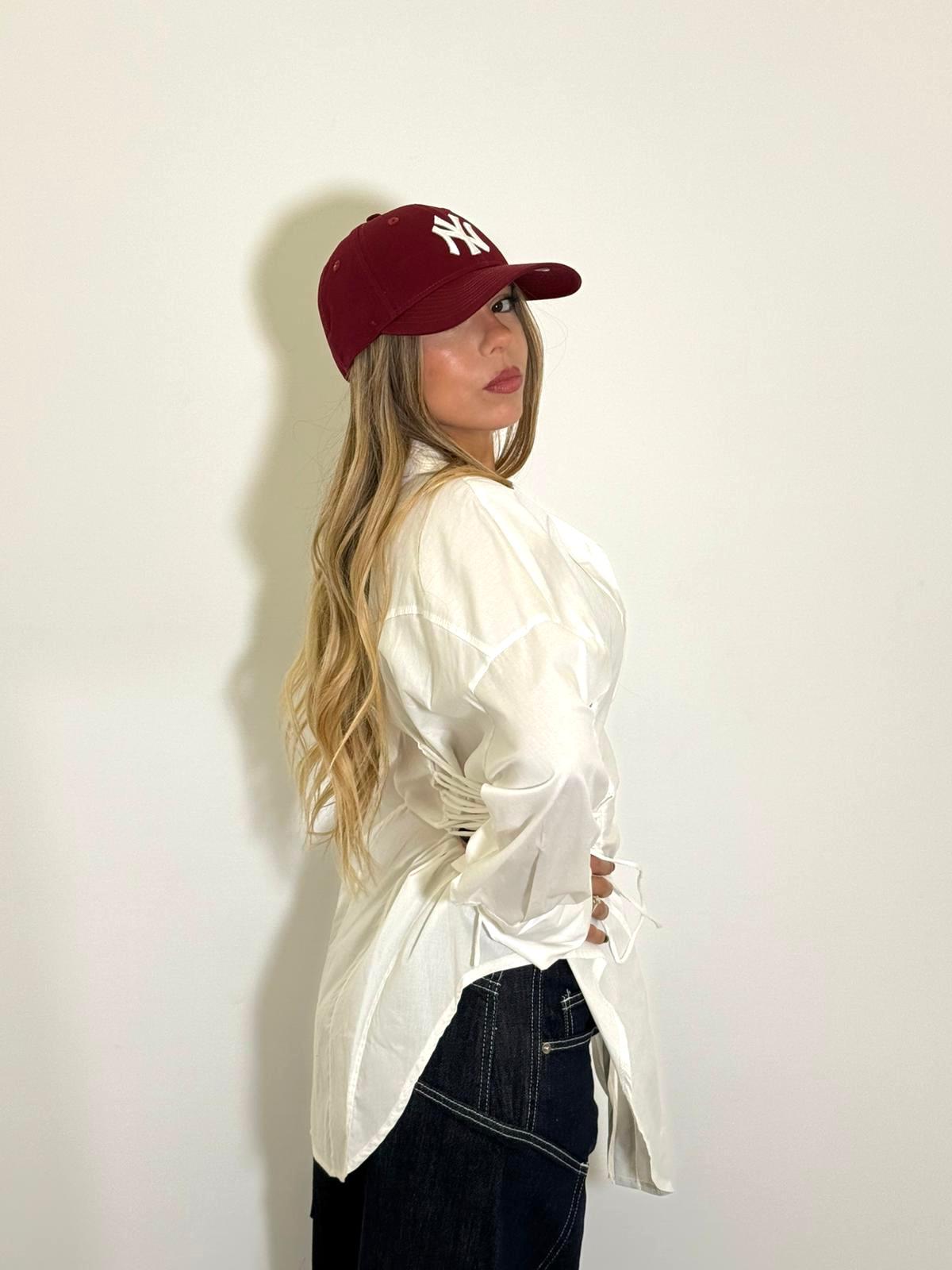 camicia in cotone aderente lunga con bottoncini e laccetti regolabili laterali.