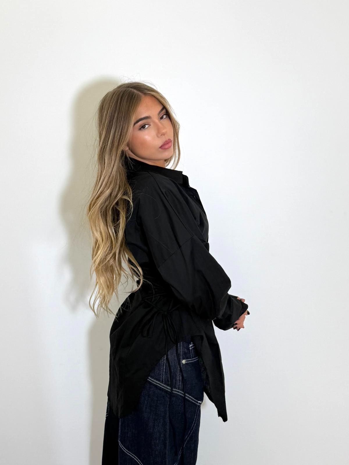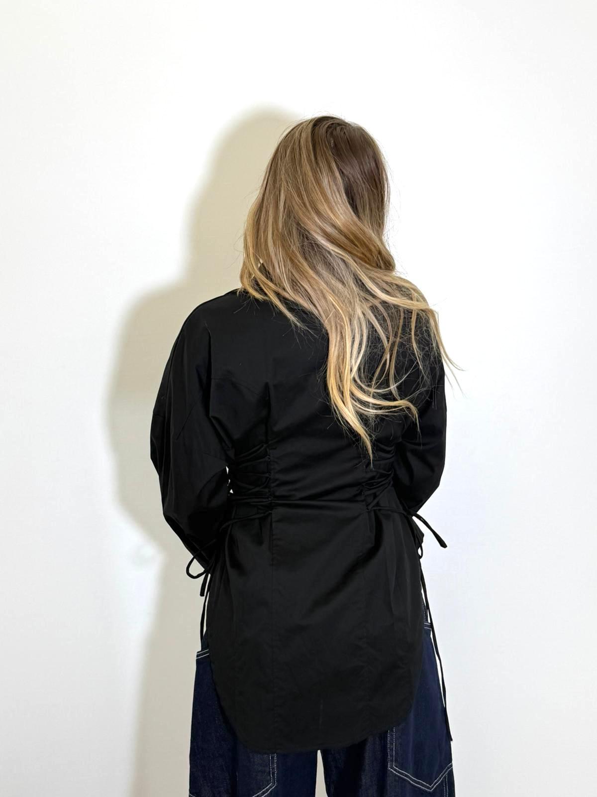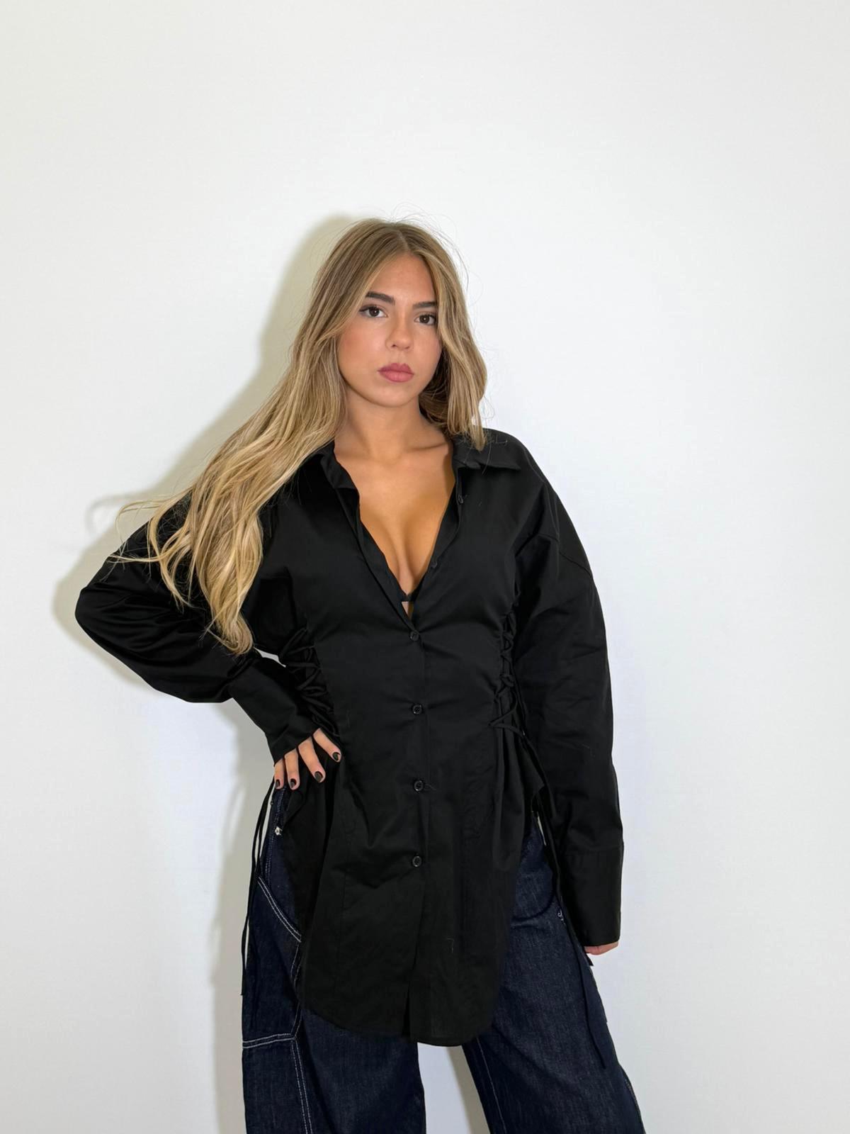 camicia in cotone aderente lunga con bottoncini e laccetti regolabili laterali.