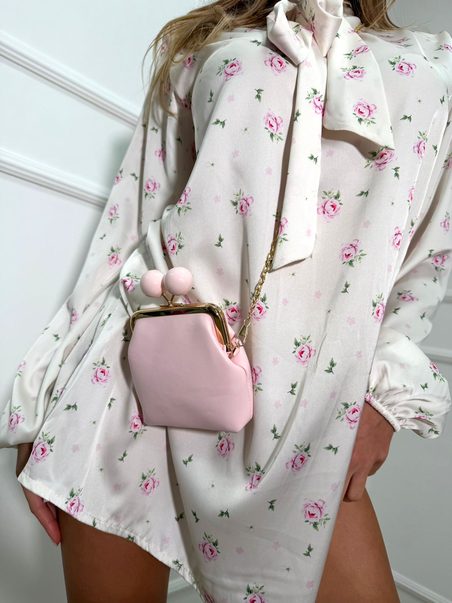 Abito in simil raso con spallina laccio al collo regolabile maniche con elastico