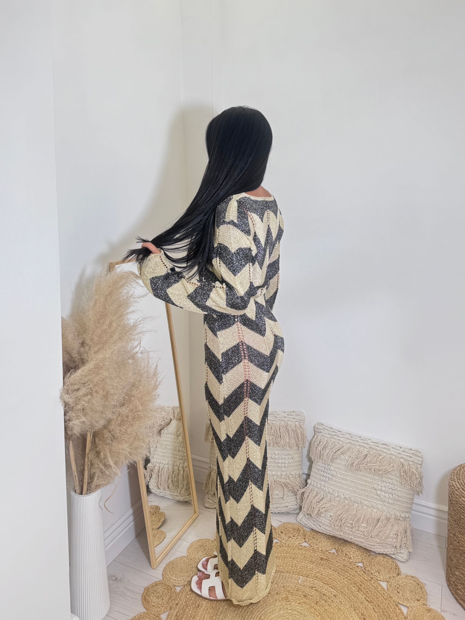 Copricostume in maglia lurex traforata con motivo zig zag e profonda scollatura con laccetto centrale e maniche lunghe,lavorazione crochet luminosa elasticizzato.