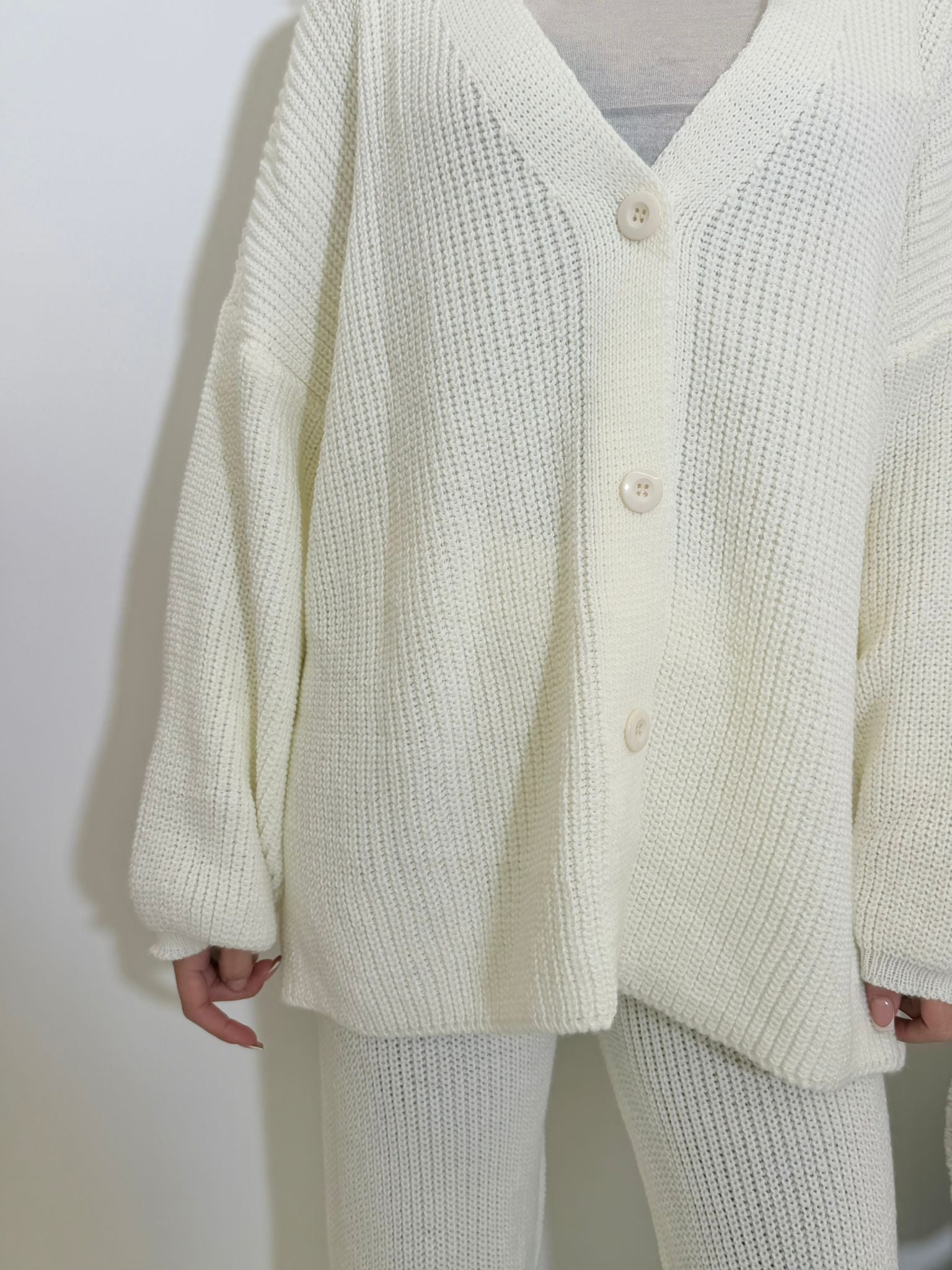 coordinato in simil lana , composto da cardigan over a maniche lunghe con bottoncini e pantalone a gamba dritta con elastico in vita.