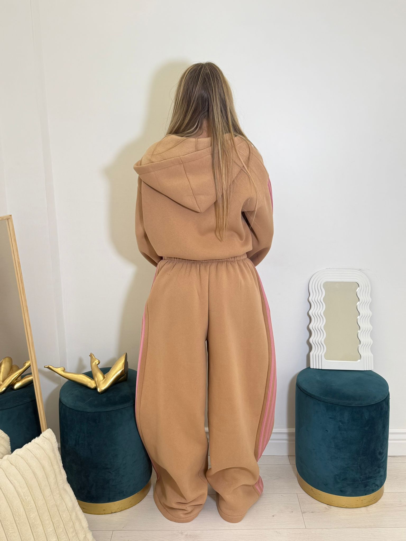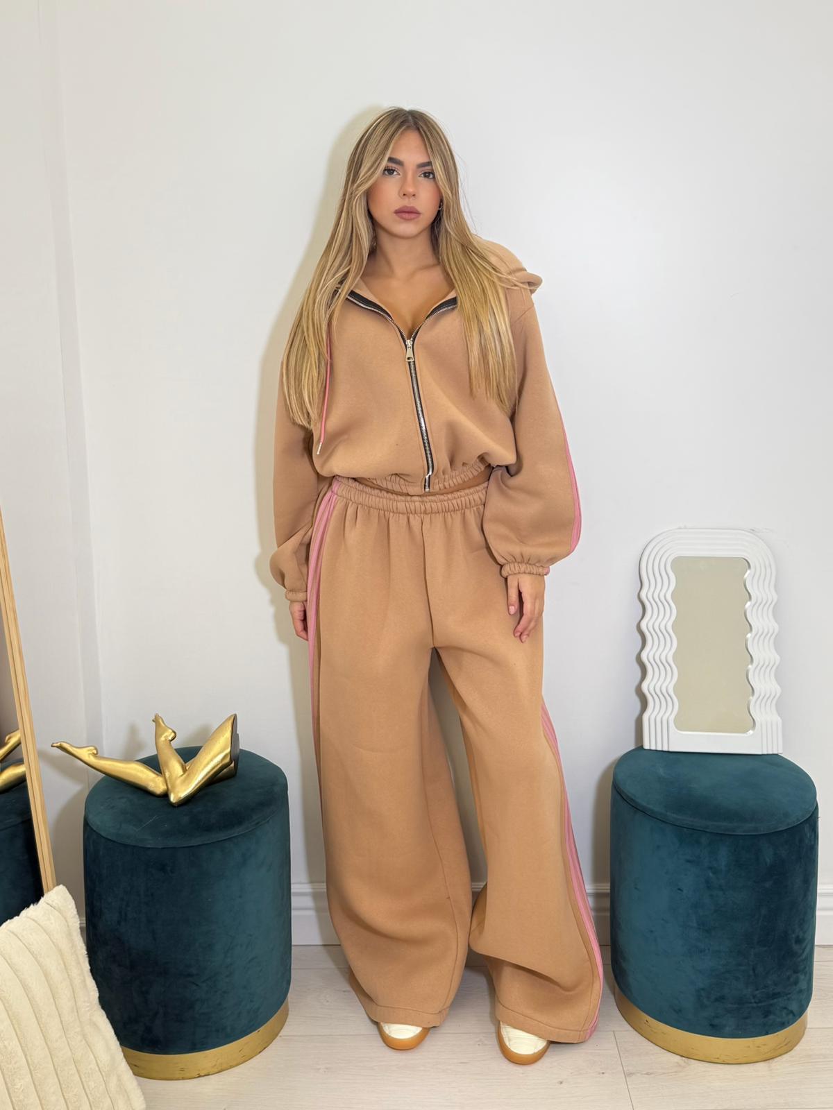 coordinato in tessuto felpato e imbottito, composto da felpa con cappuccio e zip e pantalone balloon con elastico in vita.