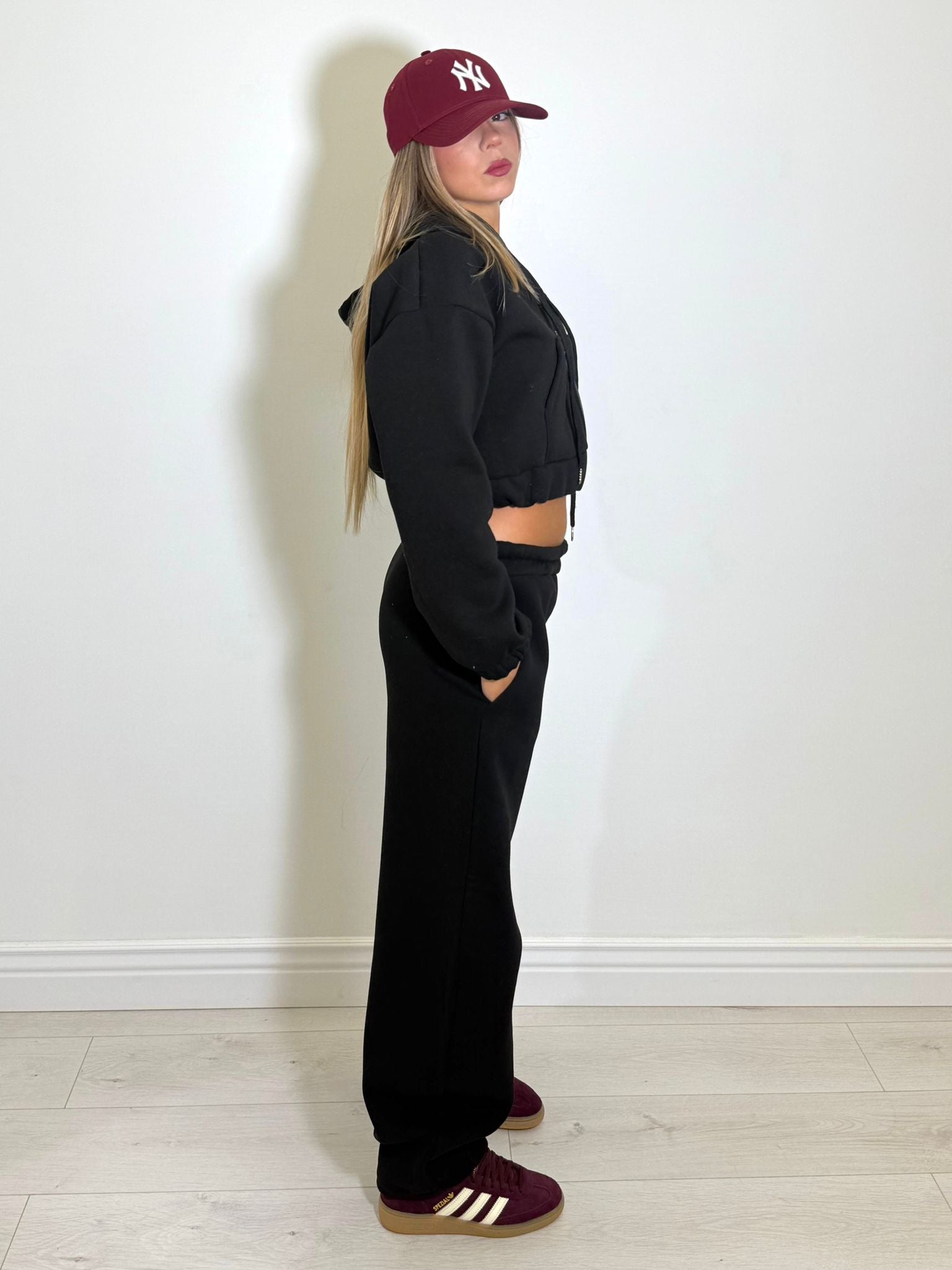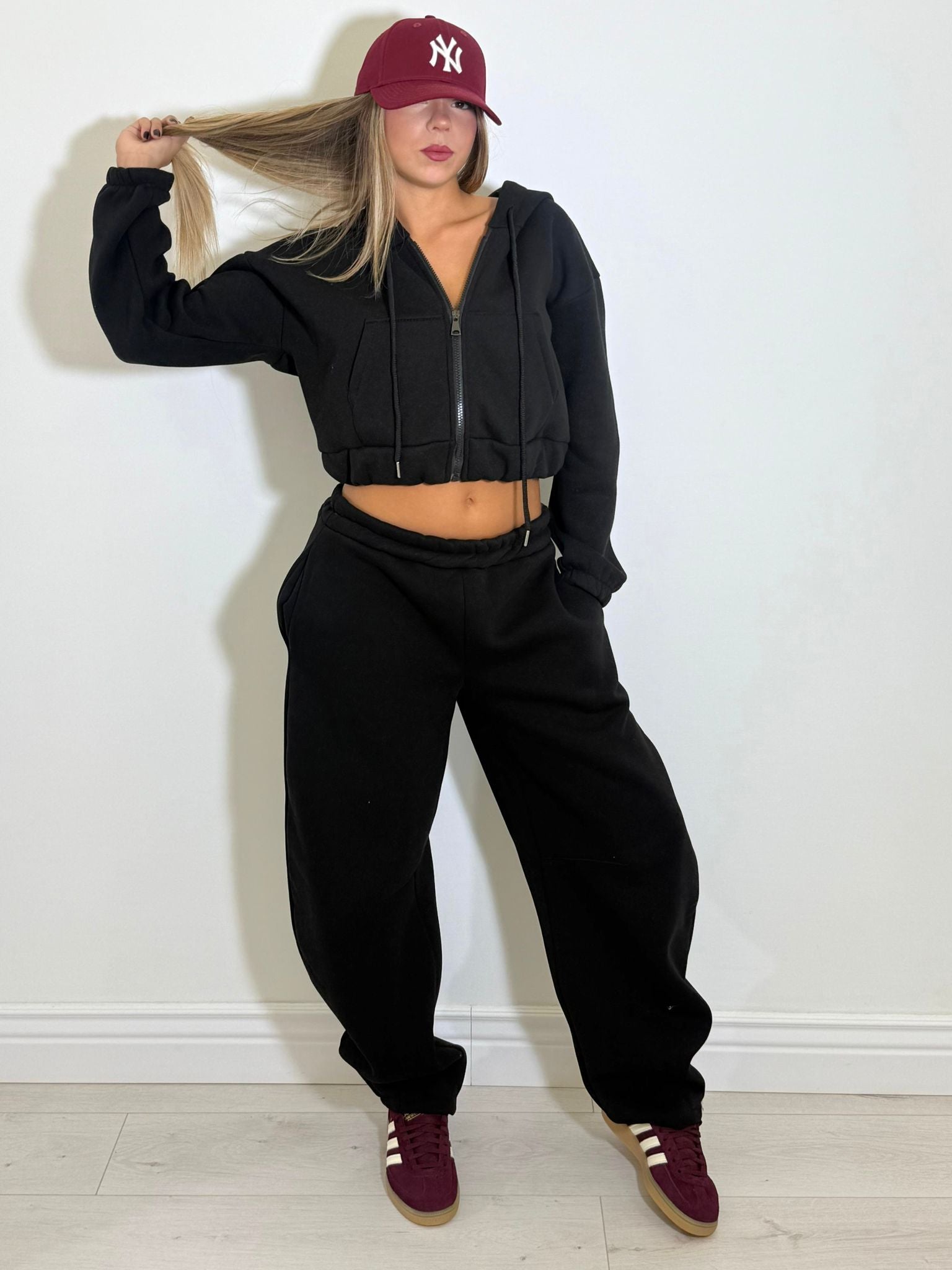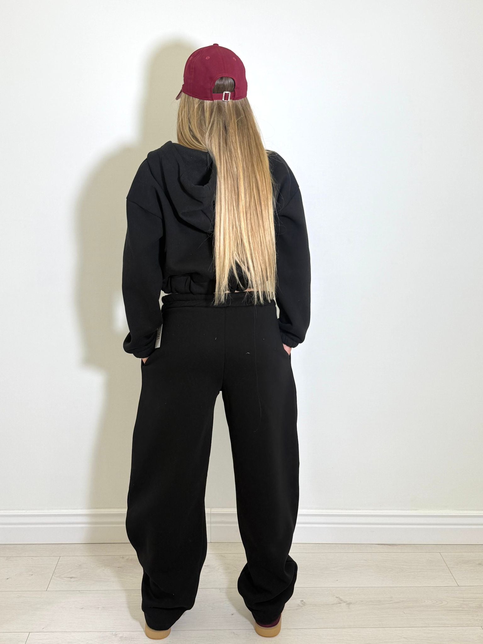 Coordinato in cotone composto da camicia con zip, colletto e maniche a palloncino, pantalone a palazzo con elastico alla caviglia.