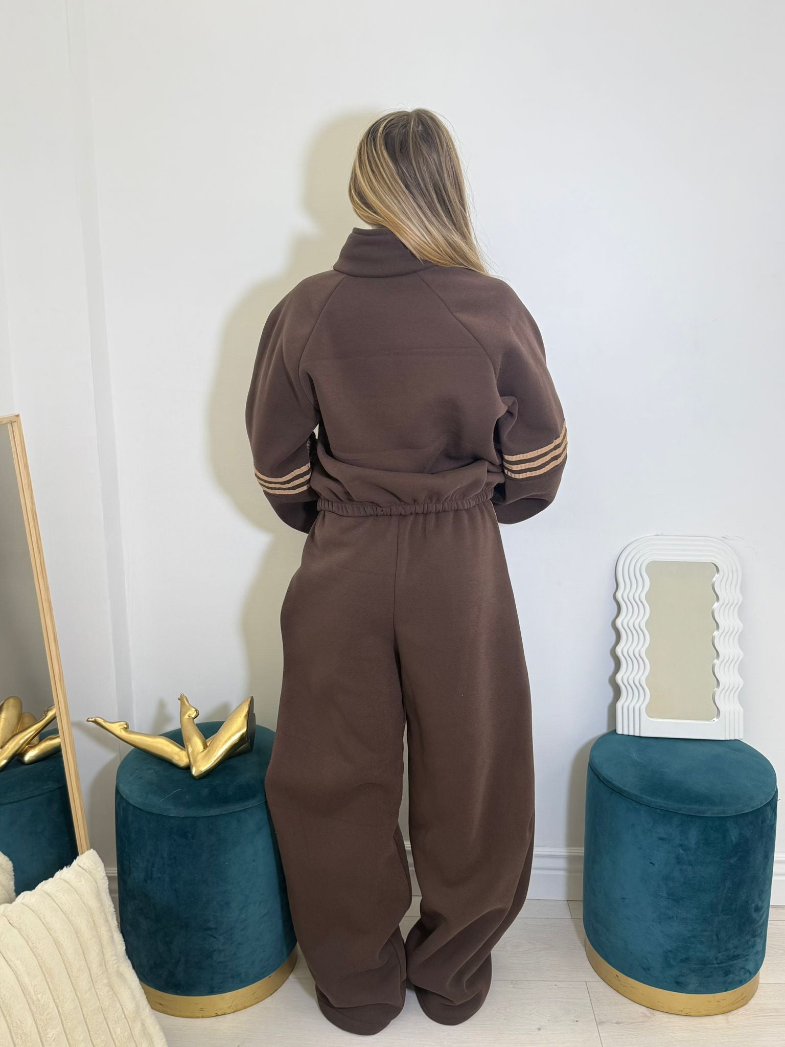 coordinato in tessuto felpato e imbottito, composto da felpa con colletto e zip e pantalone over con elastico in vita.