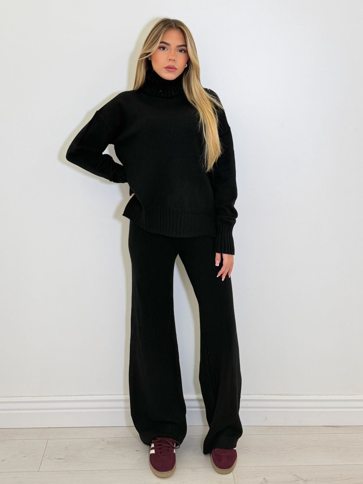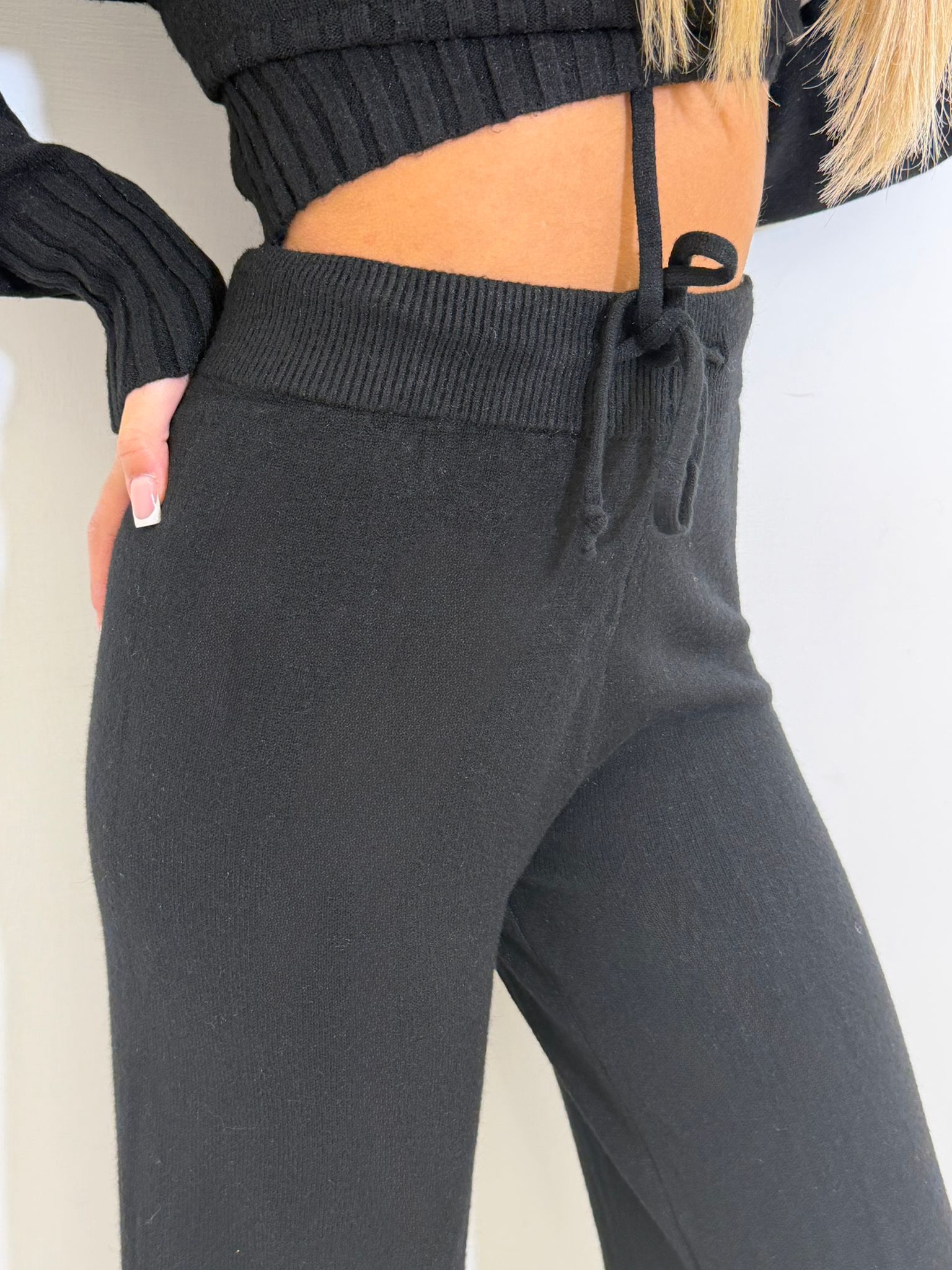 coordinato in simil lana , composto da maglioncino lupetto over a maniche lunghe e pantalone a gamba dritta con elastico in vita.