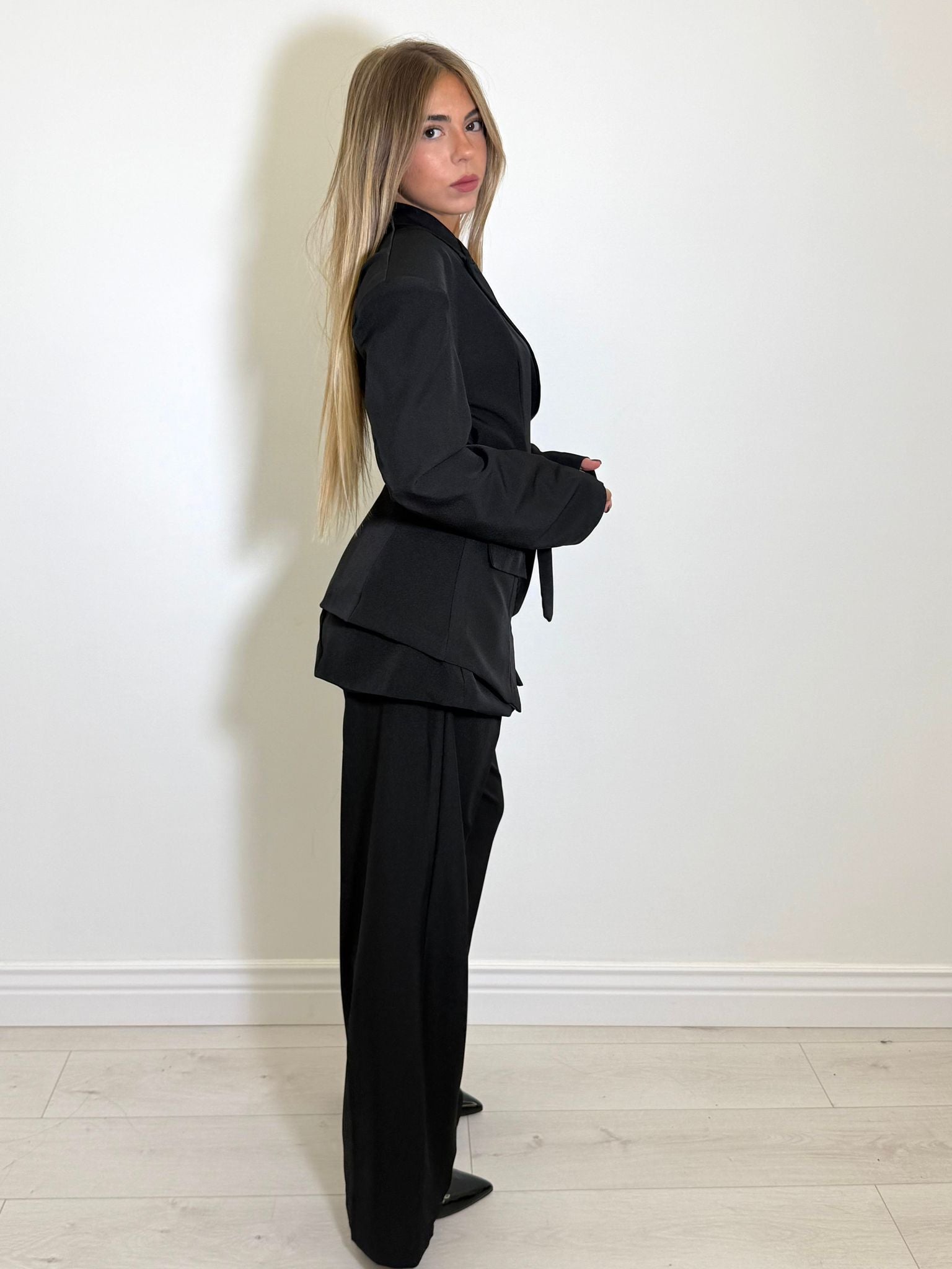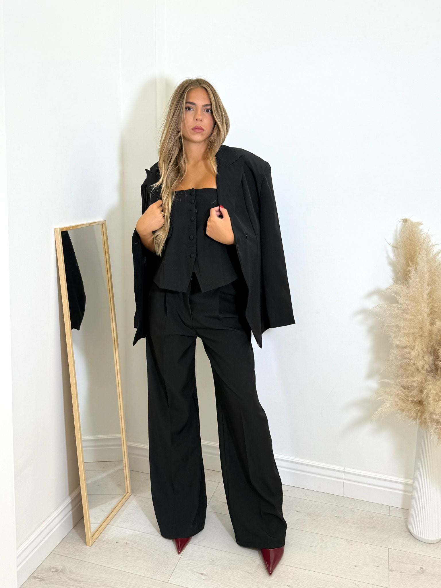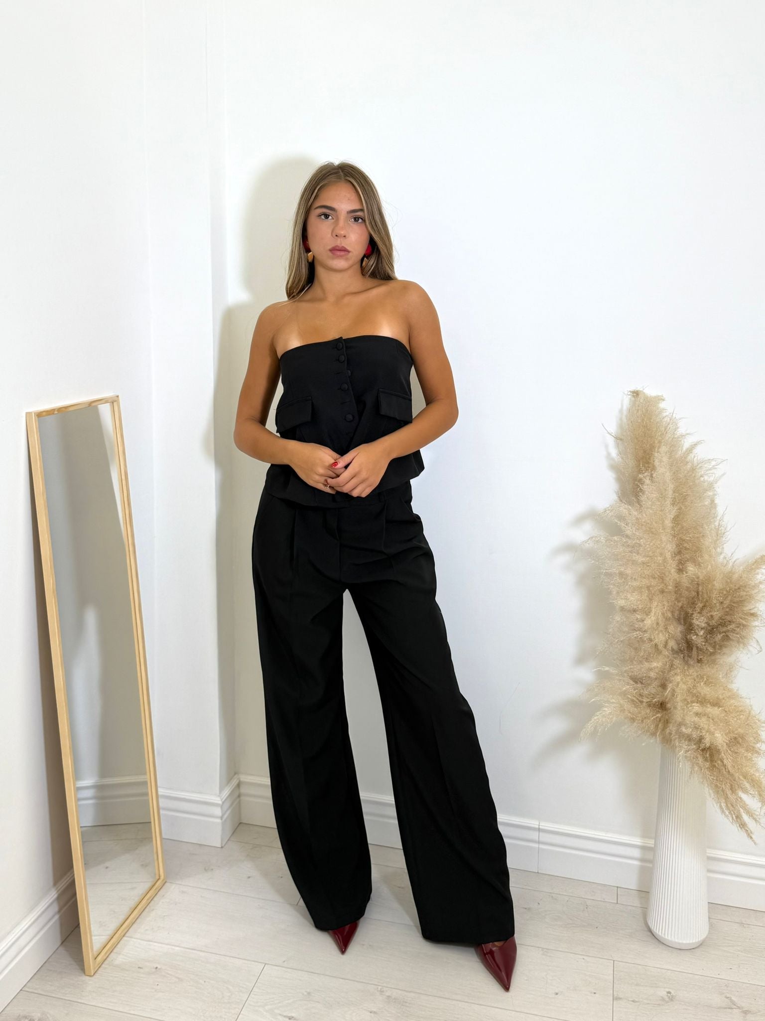 Coordinato in cotone composto da giacca con spalline e bottoni, corpetto con bottoncini e fascia anteriore regolabile e pantalone a palazzo, elastico sul retro.