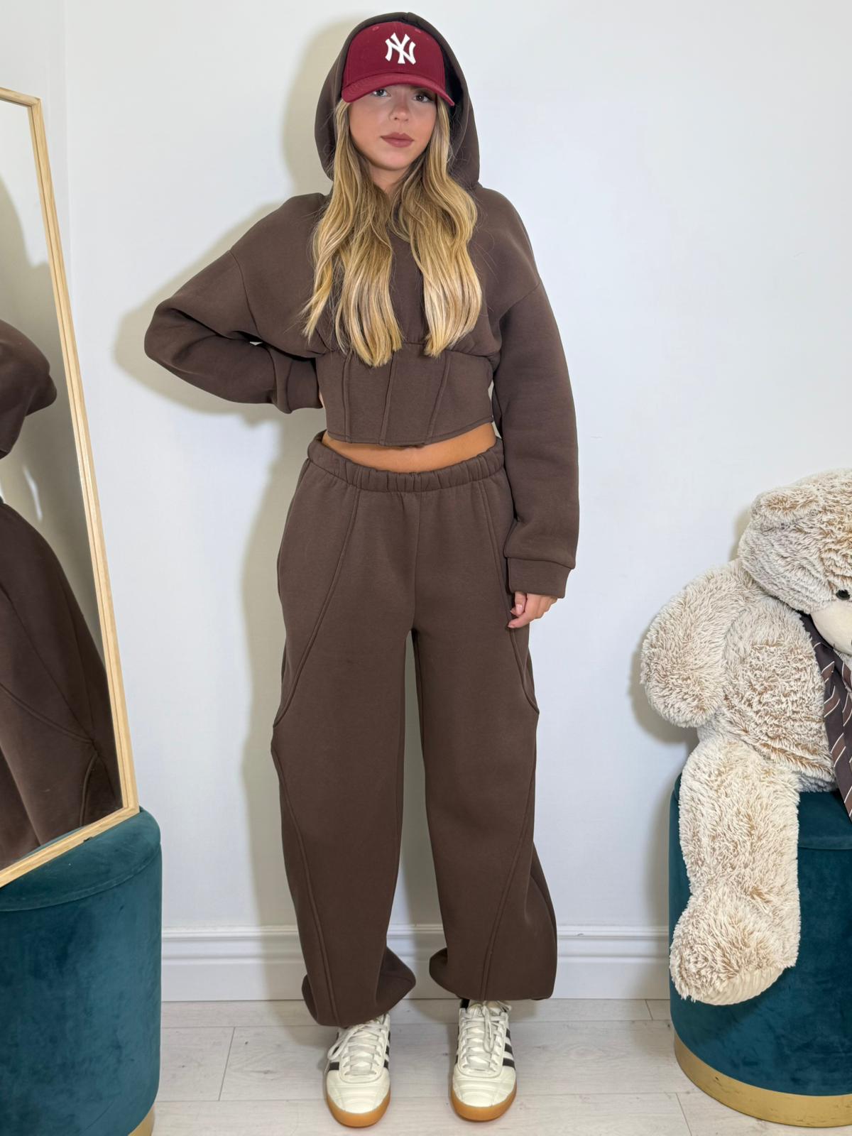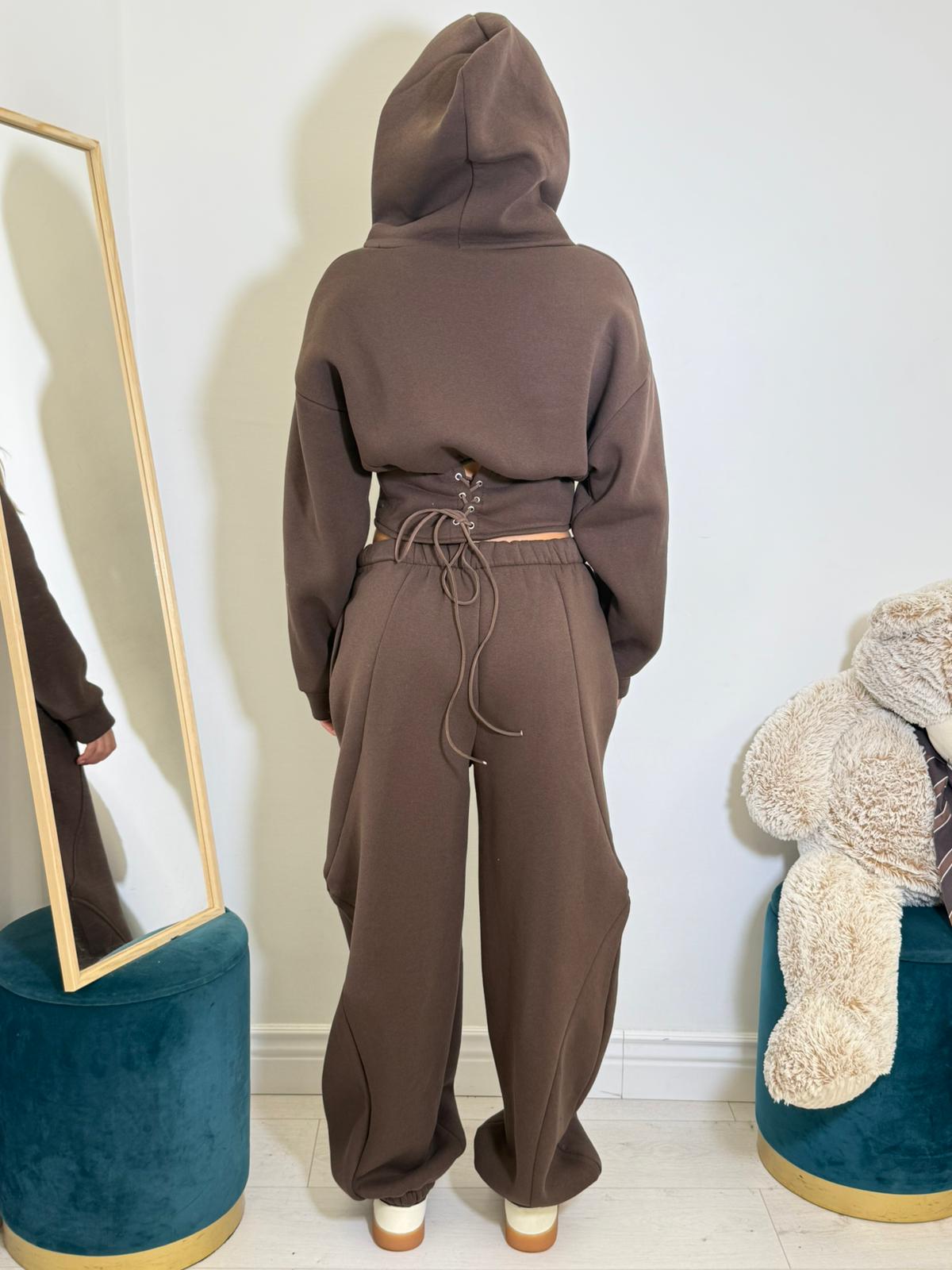 coordinato in simil cotone duro , composto da felpa crop con corpetto con laccetti regolabili e cappuccio e pantalone over con elastico in vita e molla sul fondo.