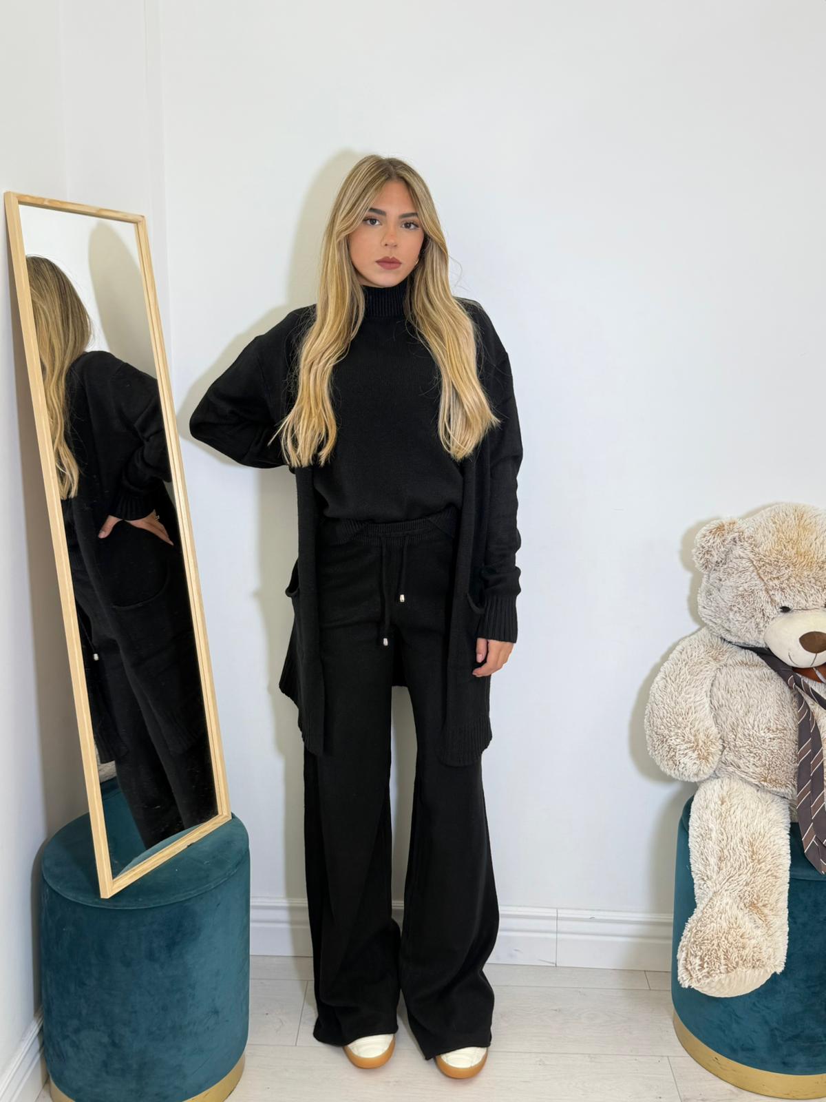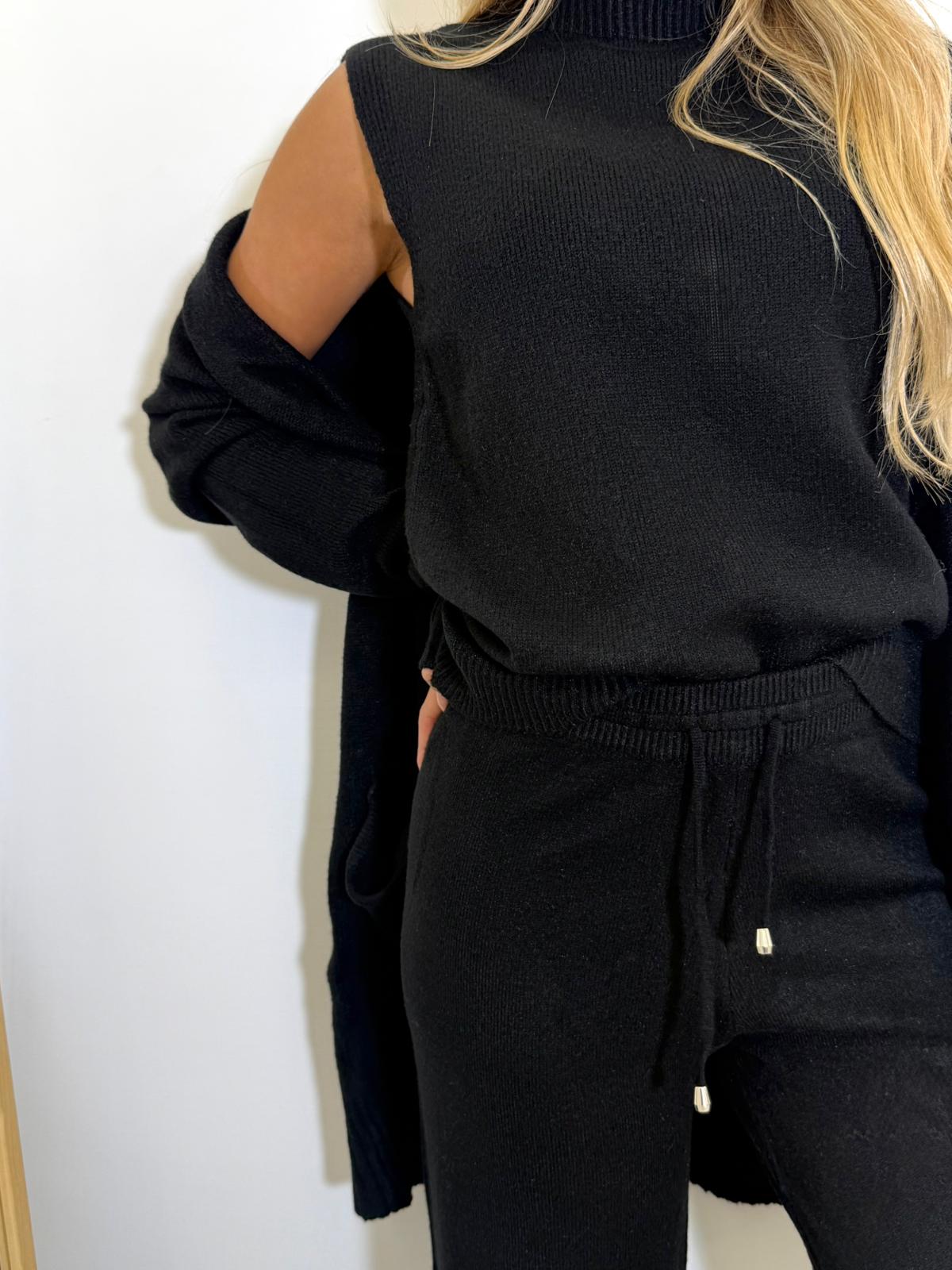 coordinato in simil lana , composto da maglioncino over smanicato con collo alto, cardigan con tasconi e pantalone a gamba dritta con elastico in vita e tasche.