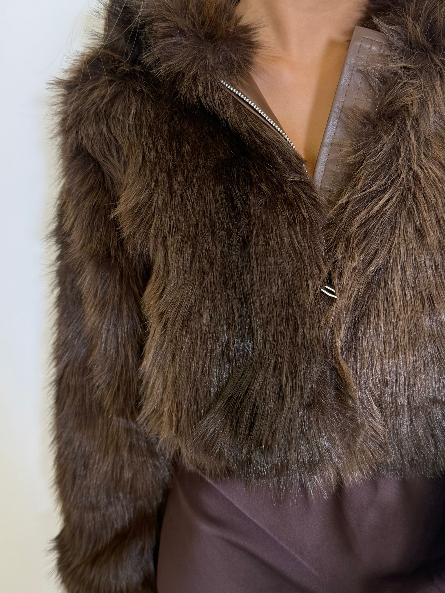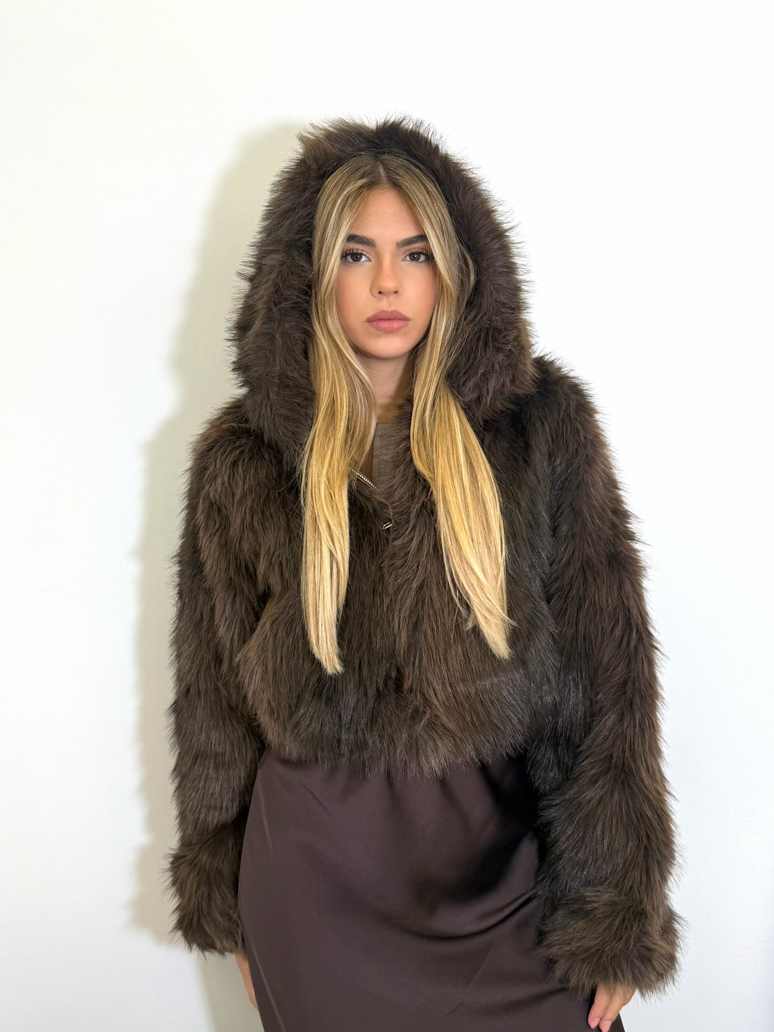 Eco- pelliccia crop a pelo semi-lungo sintetico a maniche lunghe, con zip e cappuccio.
