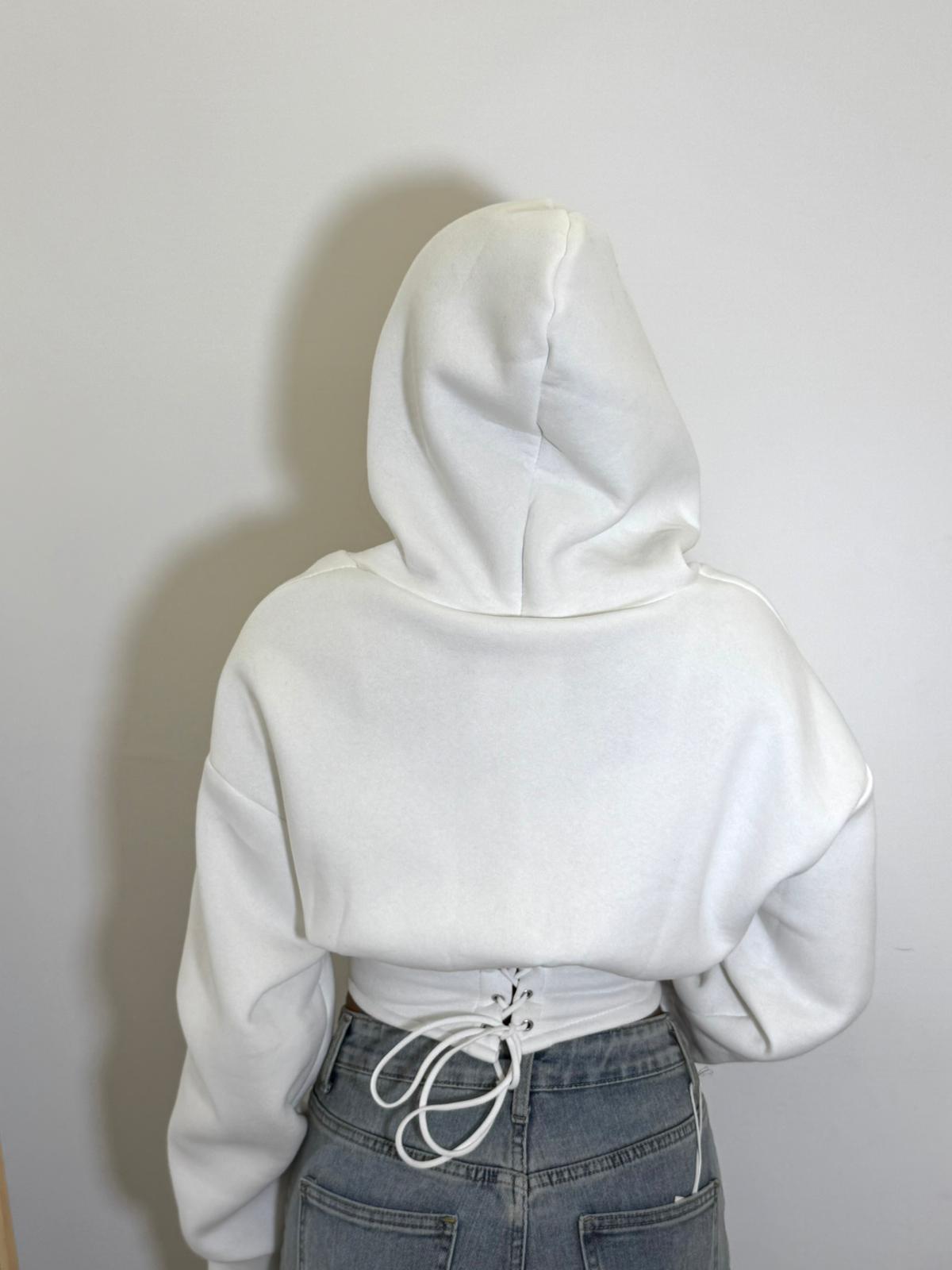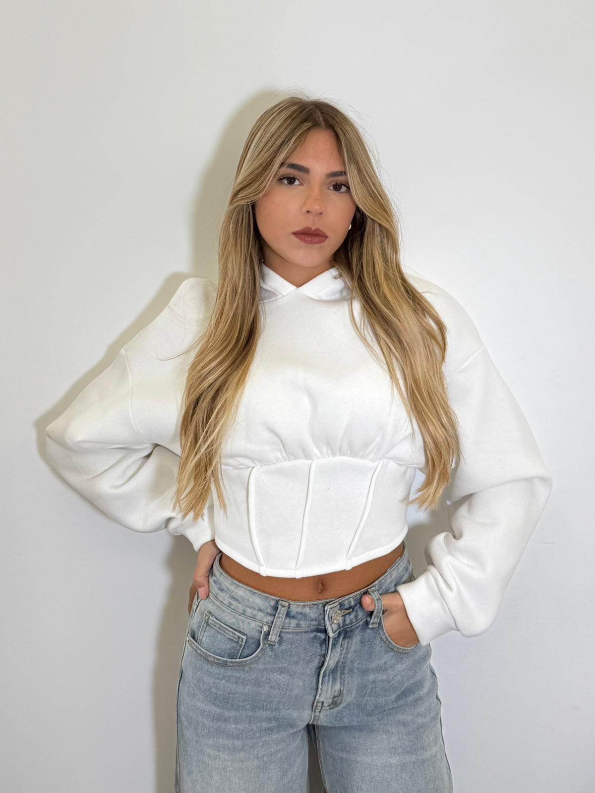 Felpa crop in simil cotone duro con cappuccio e bustier.