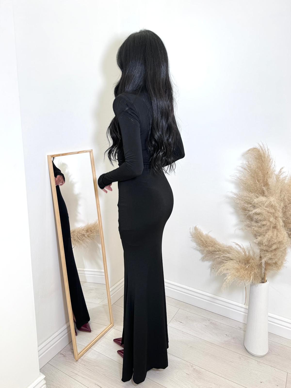 abito in jersey con maniche a guanto scollo profondo e spacco sul d'avanti