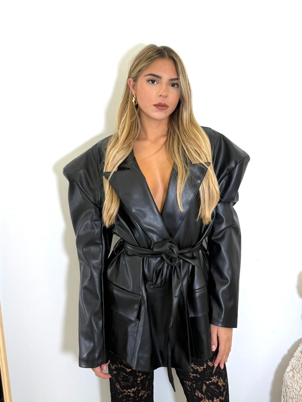 Giacca in ecopelle con spalline e cintura in vita.